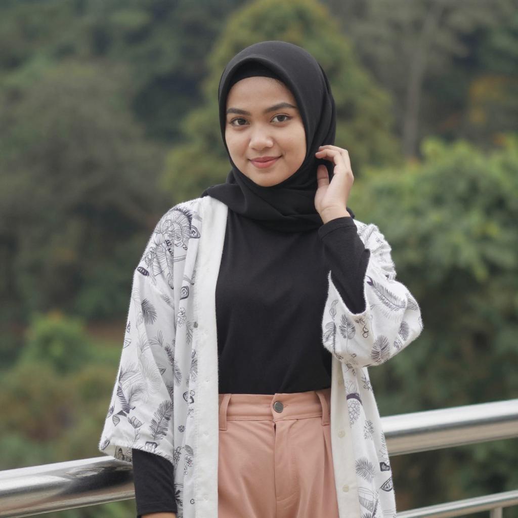 Photograph of a young Asian woman with fair skin and black hijab, wearing a black long-sleeve top and light blue jeans. She stands confidently with one hand on her hip and the other touching her hijab. Background includes blurred outdoor café tables, chairs, and greenery with a pink umbrella.