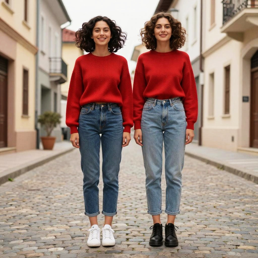 Two women with curly hair wearing matching red sweaters and blue jeans standing side by side on a cobblestone street in a residential neighborhood. One woman is wearing white sneakers and the other is wearing black shoes. The background shows European-style buildings and a peaceful street setting.