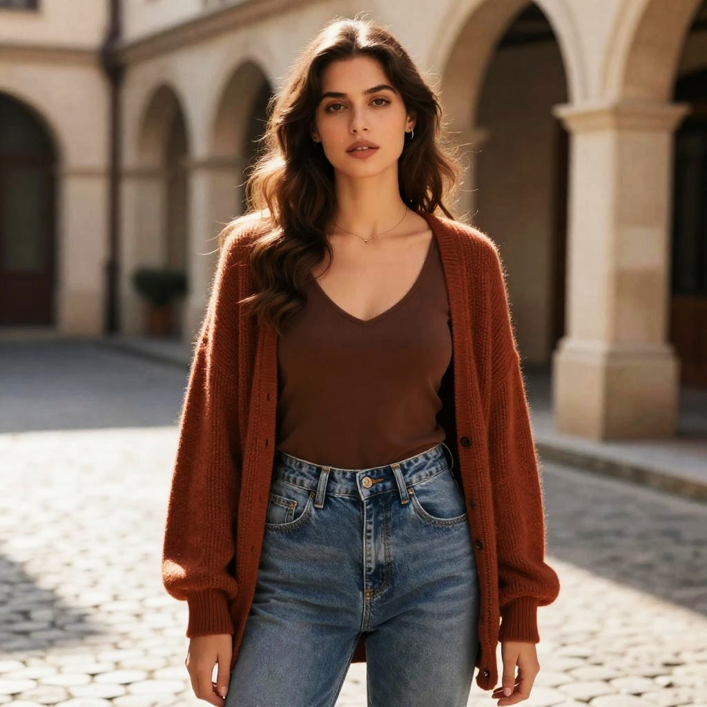 Woman Jumpers, woman in a red sweater and jeans standing on a cobblestone street