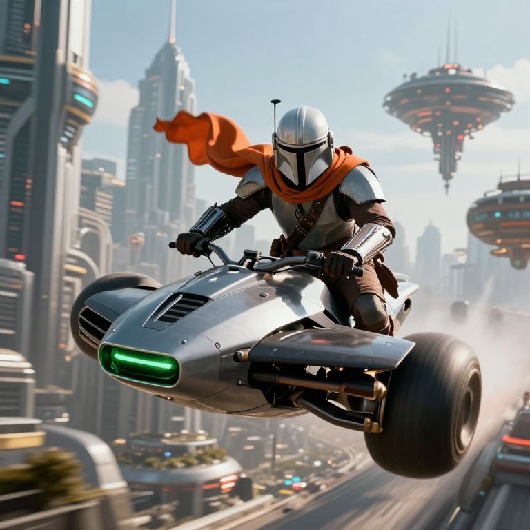 In the heart of a futuristic cityscape, a Mandalorian warrior rides a sleek speeder bike, soaring through the air with a sense of purpose. The speeder bike, a marvel of advanced technology, features a streamlined design with glowing green lights and a robust frame. The Mandalorian, clad in a white helmet and orange cape, holds the controls with a firm grip, exuding confidence and readiness. The city behind him is a testament to advanced engineering, with towering spires and floating buildings that blend seamlessly with the sky. The interplay of light and shadow creates a dynamic atmosphere, highlighting the intricate details of the speeder bike and the Mandalorian's gear. The overall composition captures a moment of intense action and adventure, set against the backdrop of a vibrant, futuristic metropolis.
