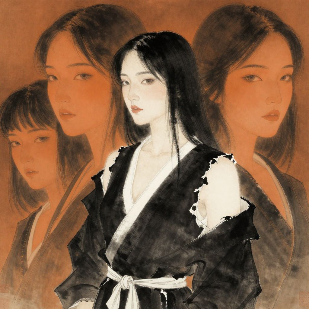 Storytelling an attractive woman in a black and white outfit, in the style of rudy siswanto, gongbi, acidwave, serene faces, hannah yata, dark orange and dark brown, cut/ripped,