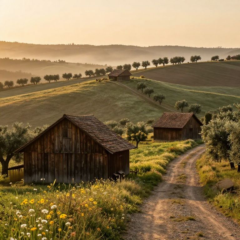 Rustico countryside landscape during golden hour, showcasing aged wooden barns, rolling hills with wildflowers, dirt paths lined with olive trees, soft mist in the background, warm earthy color palette, nostalgic and peaceful rural charm
