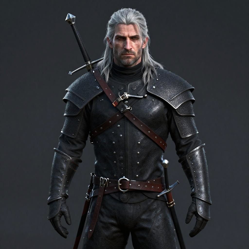 Photorealistic CGI of a muscular, bearded man with short, dark hair, wearing a black leather jacket over a black shirt, standing against a