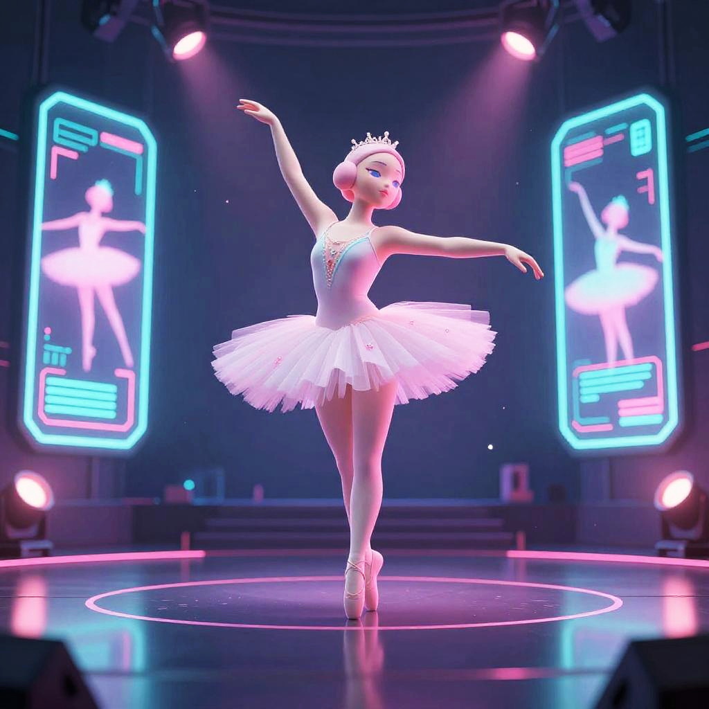 A digital CGI image of a young ballerina performing on a stage. She stands en pointe in a white, full-skirted tutu with intricate lace detailing and a delicate tiara. Her arms are gracefully extended, one above her head and the other to the side. She wears white tights and pink ballet slippers. The background features two large, neon-lit screens displaying her image in a mirror-like effect. The stage is circular with a glossy black floor, and the overall lighting is a mix of pink, blue, and purple hues, creating a futuristic, neon-lit atmosphere.