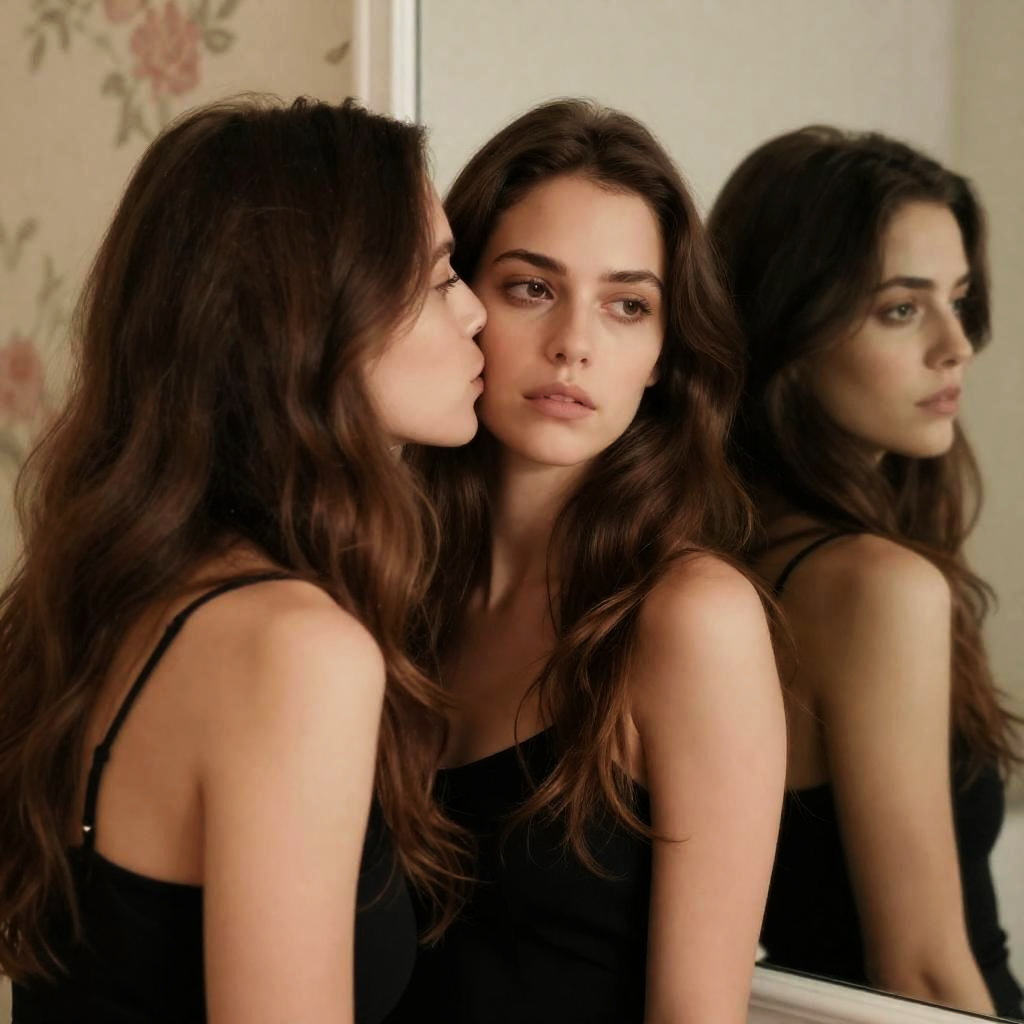Photograph of two women with long, wavy brown hair, side by side. The woman on the left kisses the cheek of the woman on the right, who looks serious. Reflection of the woman on the right in a mirror on the right side. Both women have fair skin. The background has floral wallpaper. Intense expressions on both faces.