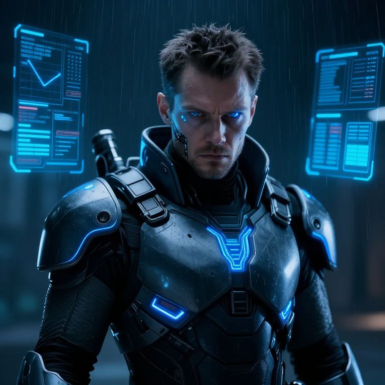 Photograph-like CGI of a serious-looking man with short, spiked brown hair and blue glowing eyes, wearing a high-tech, black armored suit with glowing blue neon patterns on the chest and shoulders. The background is dark and rainy, with blue neon holographic displays floating on either side. The armor has a sleek, futuristic design with visible textures and metallic sheen. The man's intense expression and the dramatic lighting highlight a sci-fi, cyberpunk aesthetic. Raindrops are visible on the armor, adding a wet, gritty texture to the scene.