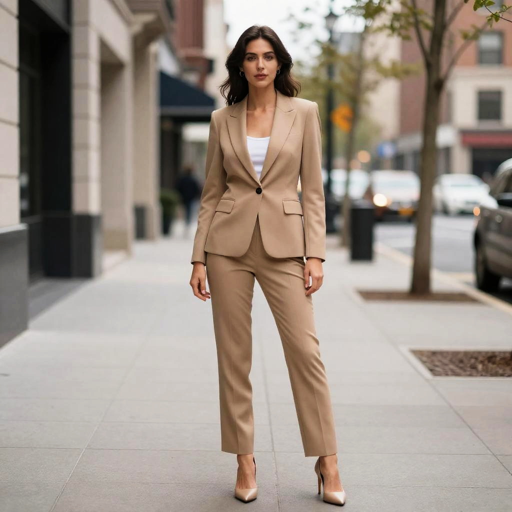 Woman Trouser Suits Weddings Costume, woman in a tan suit standing on a sidewalk in a city