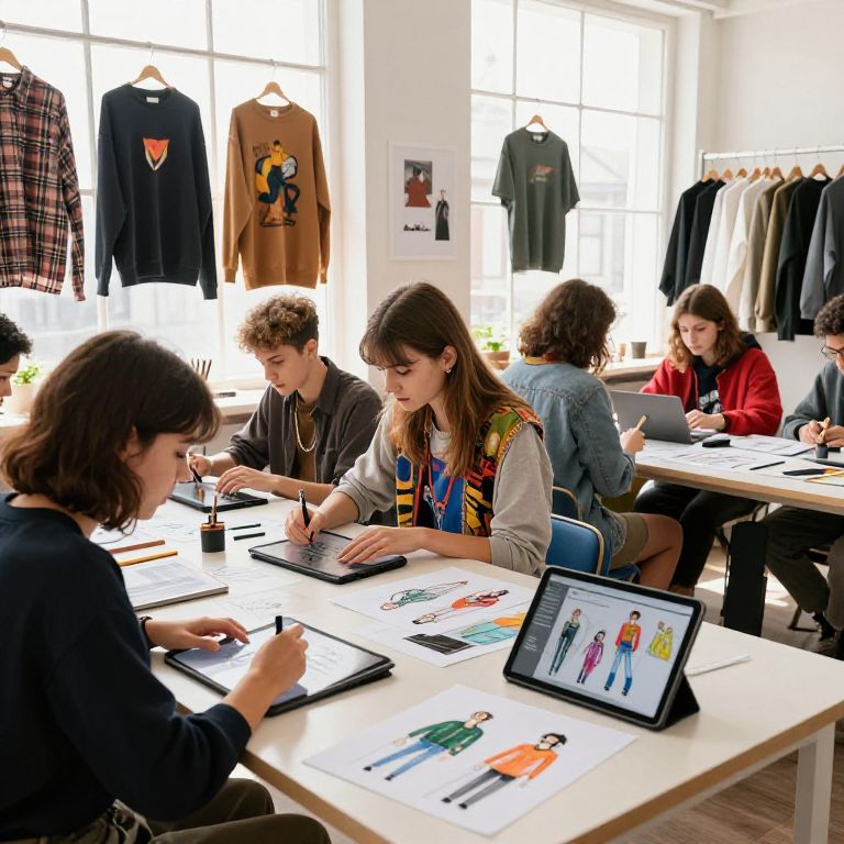 Design clothes for free inspired by street style, young designers sketching urban outfits on tablets, cozy creative workshop, bright daylight streaming through large windows, casual fashion pieces with bold colors and patterns, dynamic and lively atmosphere, mixed media textures