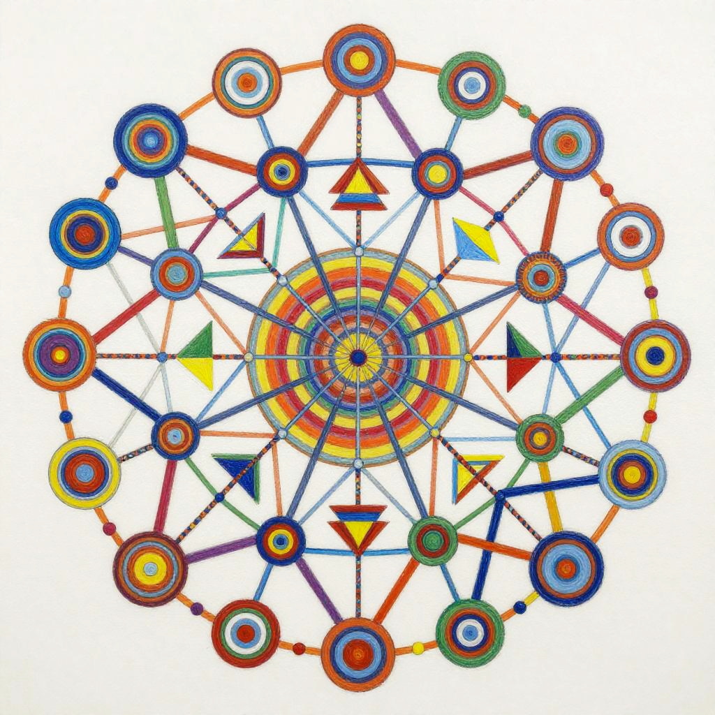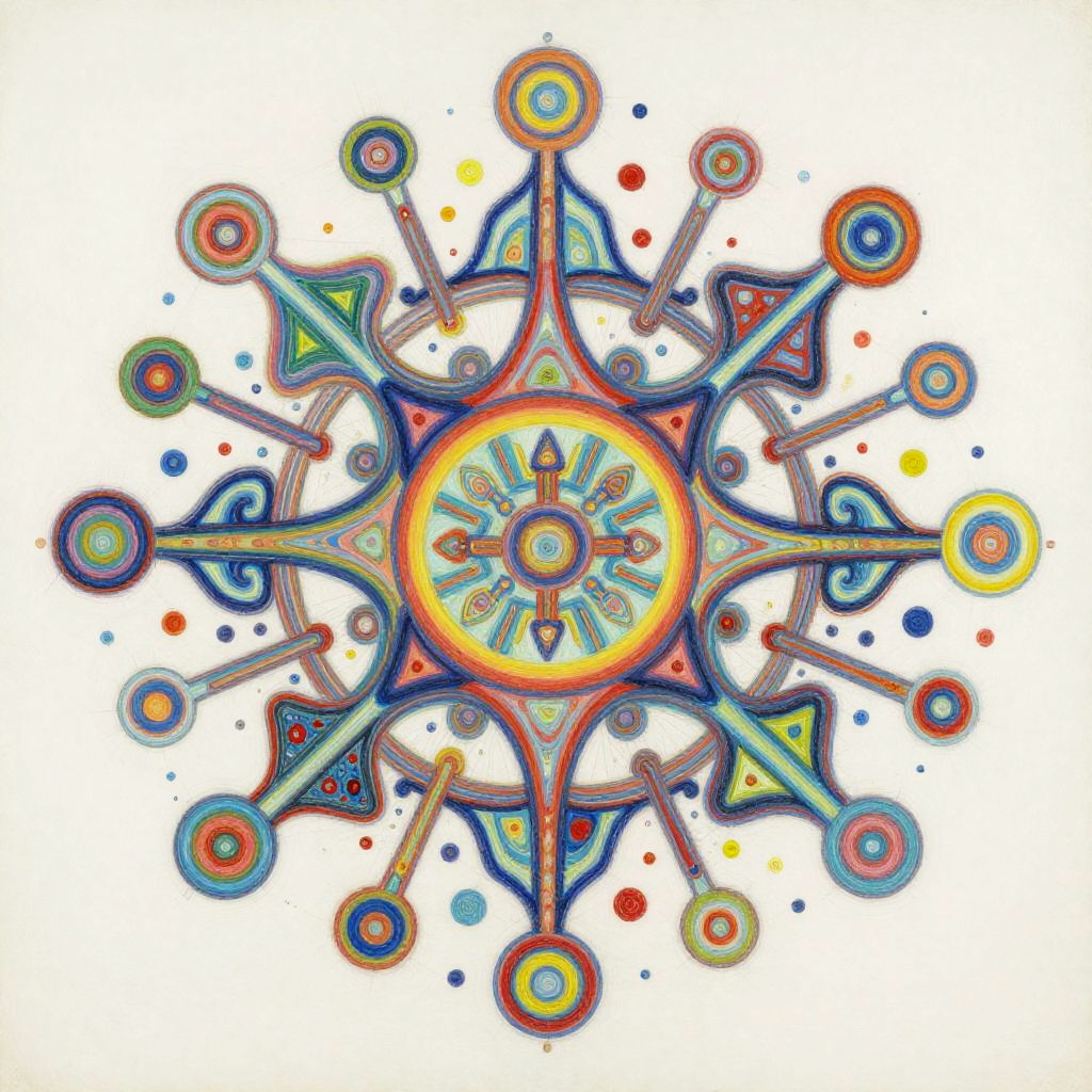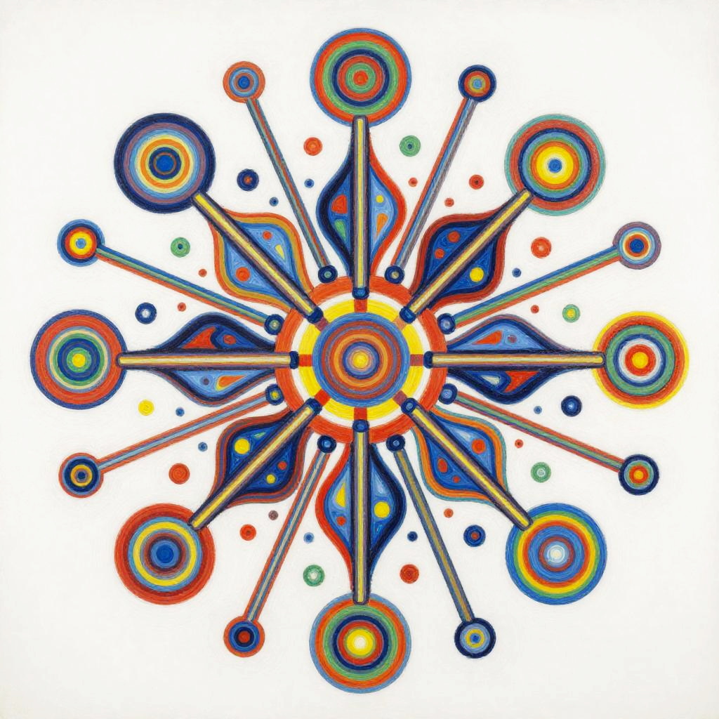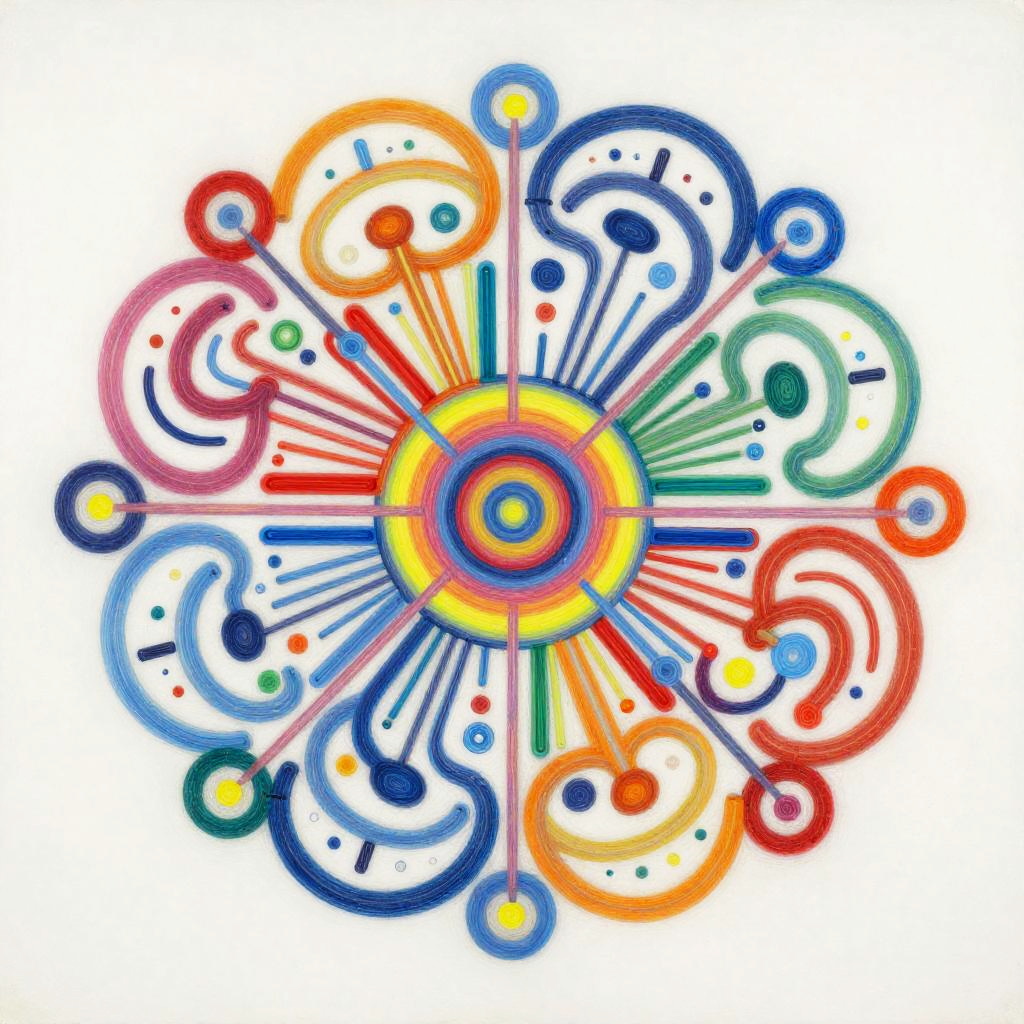 Life Drawing envision a vibrant and dynamic composition of interconnected nodes and pathways representing a linguistic network. The painting would consist of a colorful array of geometric shapes and patterns, with lines and curves linking them together in a complex web-like structure. The shapes and patterns would be constantly shifting and evolving, reflecting connection. In the center of the painting, there would be a focal point that represents the core programming, from which all the other elements radiate outwards. This focal point would be surrounded by a halo of bright colors, representing the diverse range of knowledge and skills. Overall, the painting would convey a sense of energy, intelligence, and creativity, capturing the essence of communication evolution. Done in a conceptual abstraction in vivid colors over watercolor, juxtaposition of vivid colors and bold shadowy darks, drippy, splashy chaos in the style of Julie Mehretu
