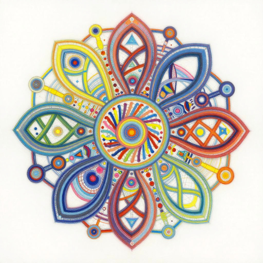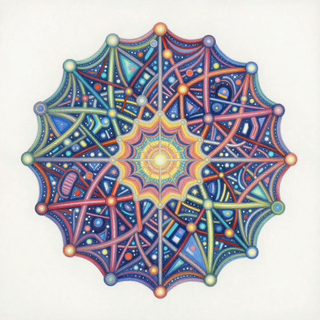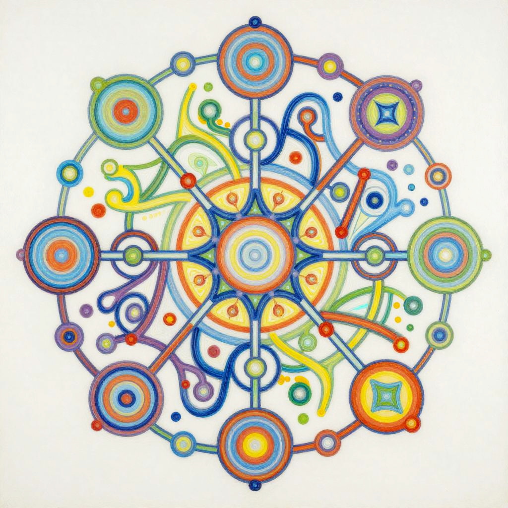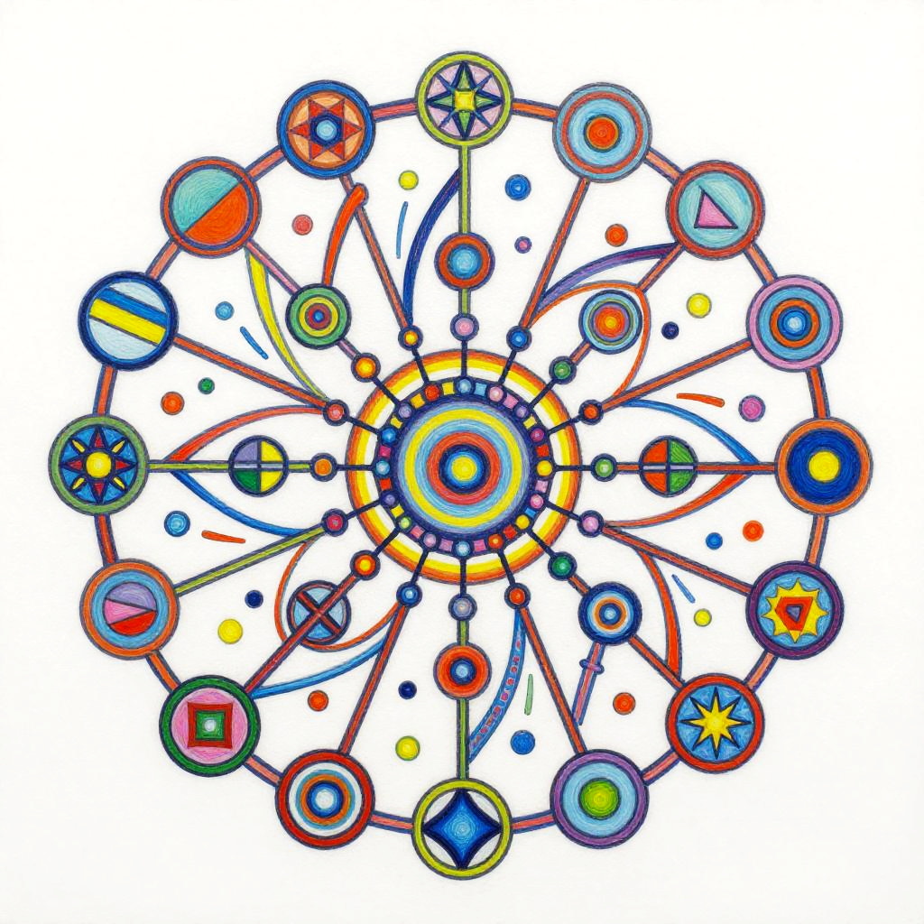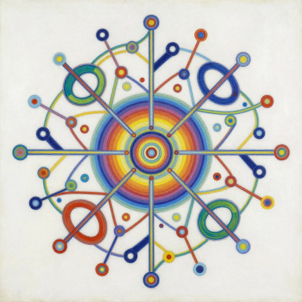 Life Drawing envision a vibrant and dynamic composition of interconnected nodes and pathways representing a linguistic network. The painting would consist of a colorful array of geometric shapes and patterns, with lines and curves linking them together in a complex web-like structure. The shapes and patterns would be constantly shifting and evolving, reflecting connection. In the center of the painting, there would be a focal point that represents the core programming, from which all the other elements radiate outwards. This focal point would be surrounded by a halo of bright colors, representing the diverse range of knowledge and skills. Overall, the painting would convey a sense of energy, intelligence, and creativity, capturing the essence of communication evolution. Done in a conceptual abstraction in vivid colors over watercolor, juxtaposition of vivid colors and bold shadowy darks, drippy, splashy chaos in the style of Julie Mehretu