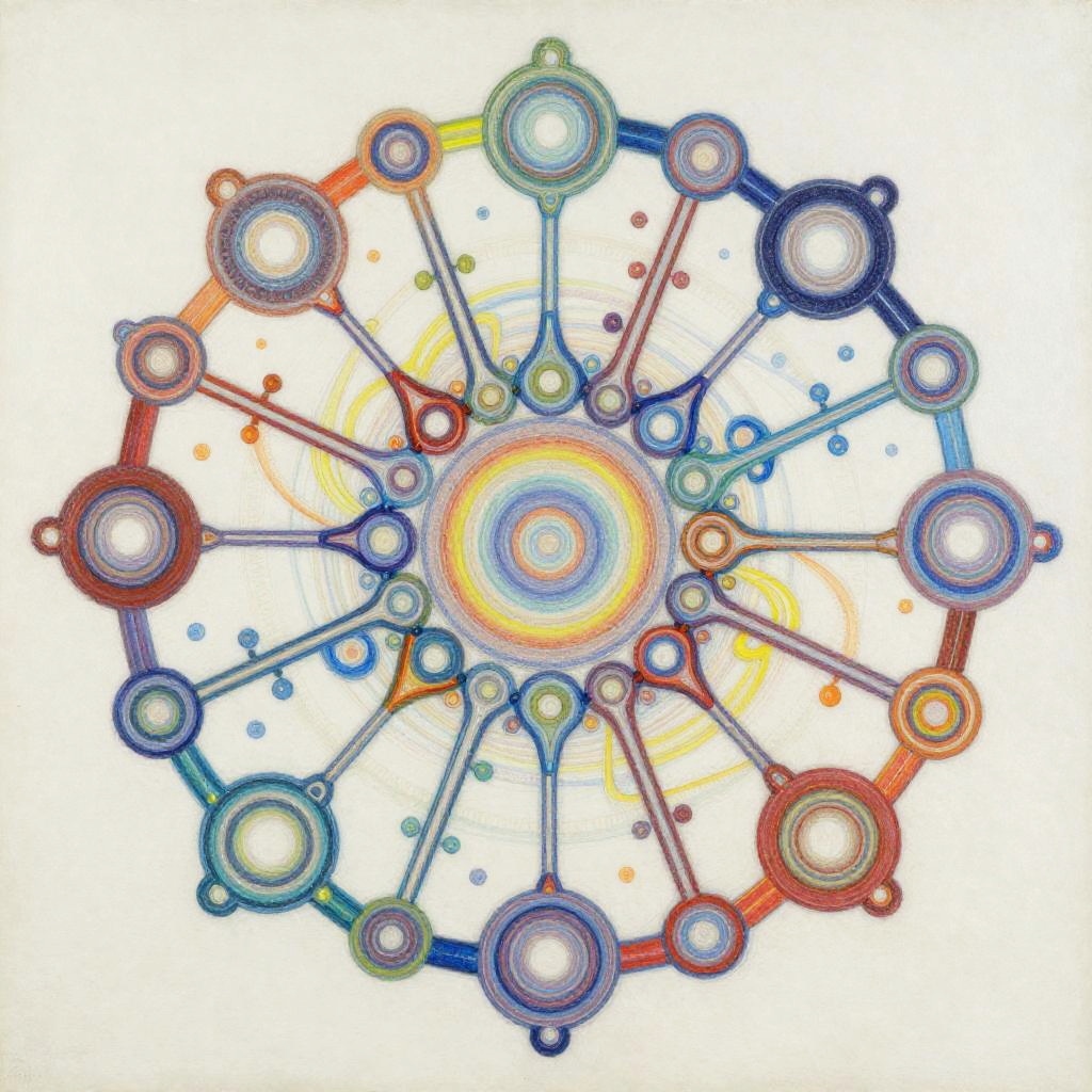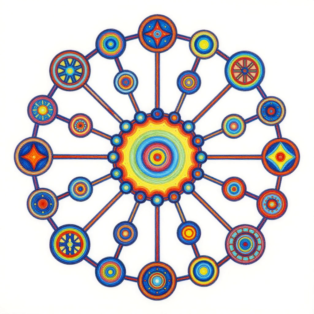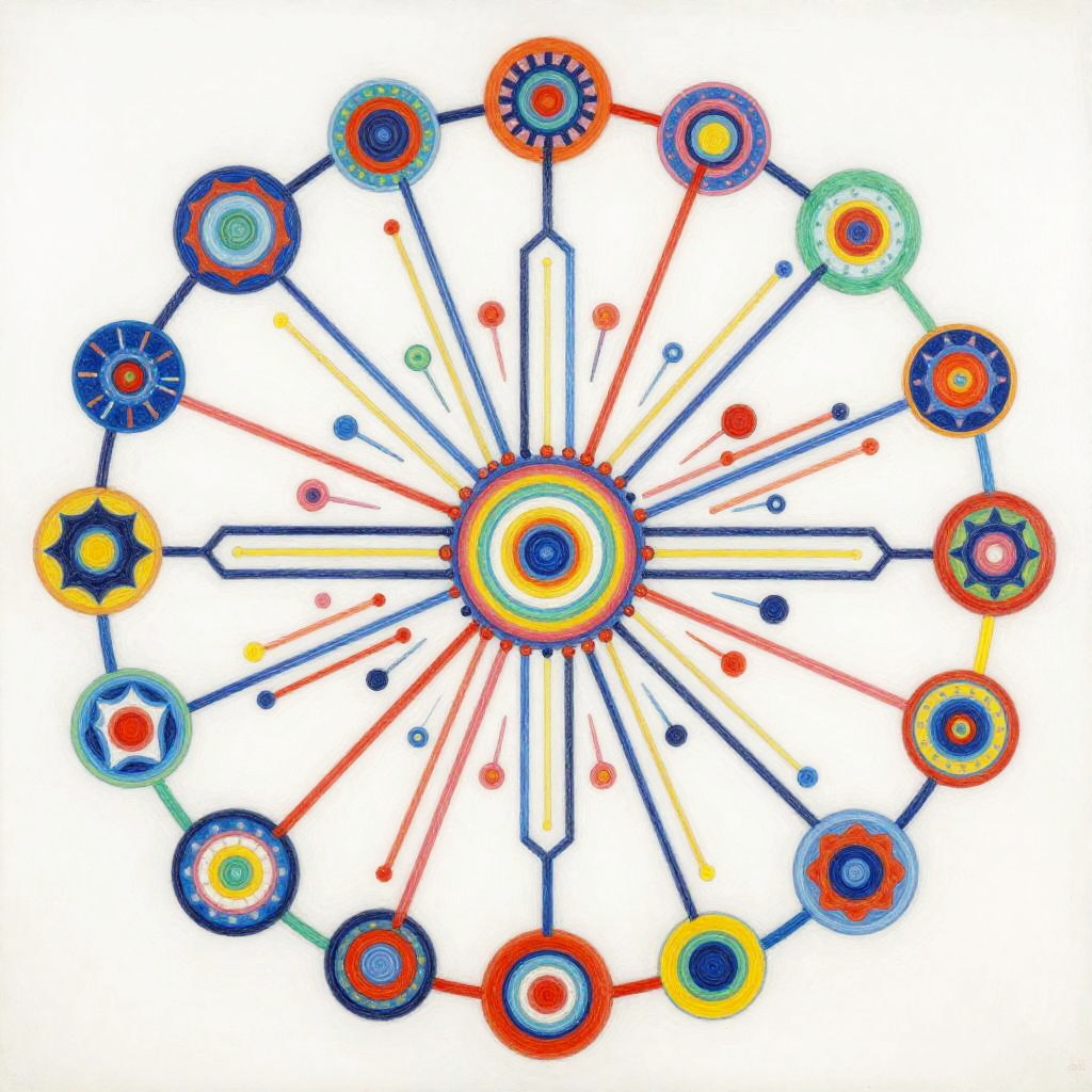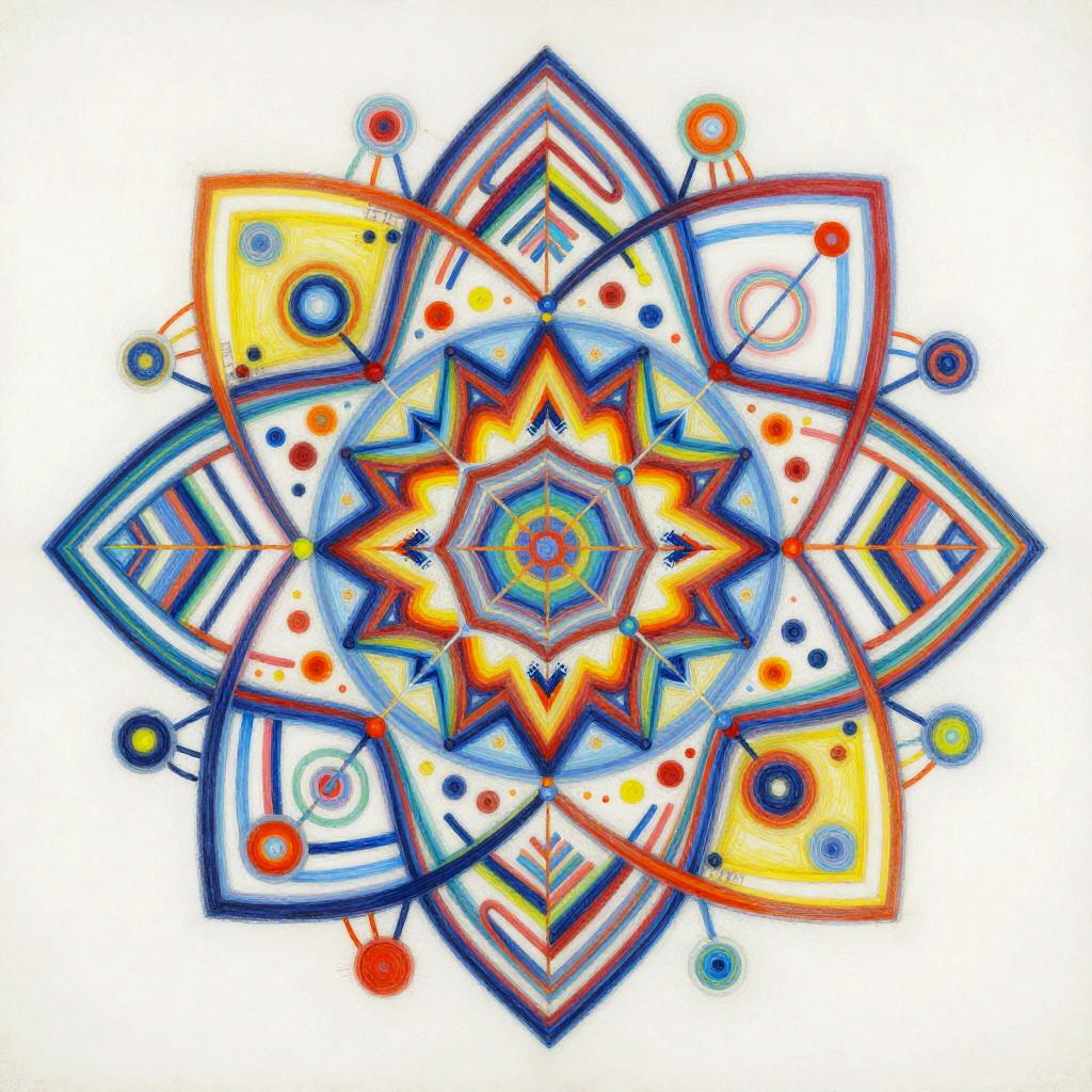 Life Drawing envision a vibrant and dynamic composition of interconnected nodes and pathways representing a linguistic network. The painting would consist of a colorful array of geometric shapes and patterns, with lines and curves linking them together in a complex web-like structure. The shapes and patterns would be constantly shifting and evolving, reflecting connection. In the center of the painting, there would be a focal point that represents the core programming, from which all the other elements radiate outwards. This focal point would be surrounded by a halo of bright colors, representing the diverse range of knowledge and skills. Overall, the painting would convey a sense of energy, intelligence, and creativity, capturing the essence of communication evolution. Done in a conceptual abstraction in vivid colors over watercolor, juxtaposition of vivid colors and bold shadowy darks, drippy, splashy chaos in the style of Julie Mehretu