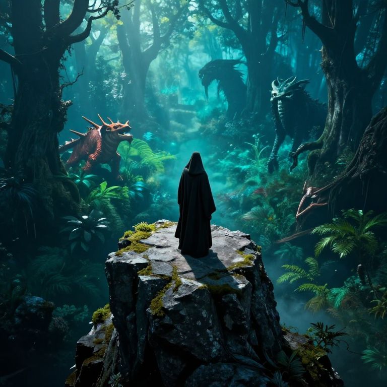 In this digital fantasy artwork, a cloaked figure stands on a moss-covered stone pedestal in a dense, mystical forest. The figure, in dark, hooded robes, faces away, silhouetted against the vibrant, blue-green light filtering through the dense canopy above. Tall, twisted trees with gnarled branches surround the scene, and ferns and other lush vegetation fill the foreground. A large, dragon-like creature with red scales and a menacing appearance is partially visible to the left, adding a sense of danger. The background fades into a misty, ethereal blue, enhancing the magical atmosphere. The artwork combines elements of fantasy and realism, using vivid colors and detailed textures.