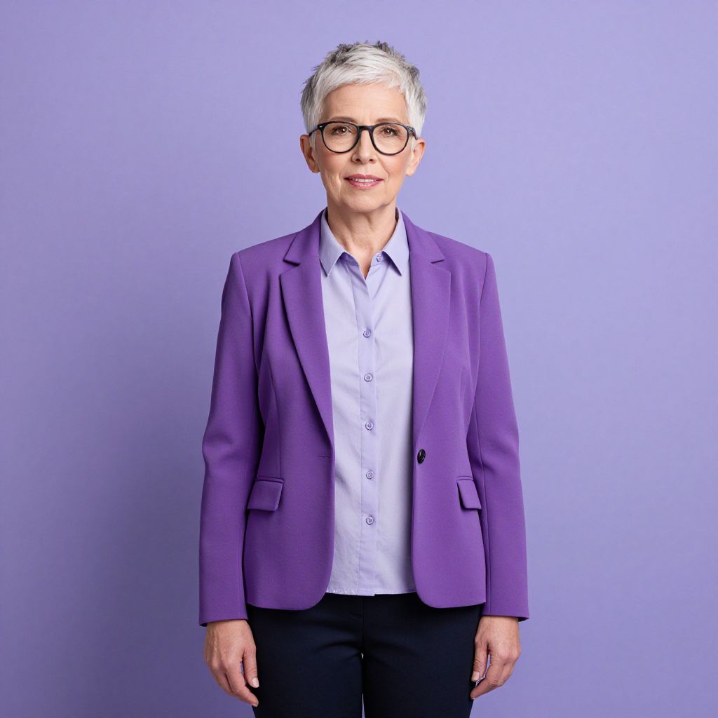 Photograph of an older white woman with short, grayish-blonde hair and wearing black-rimmed glasses. She is dressed in a bright purple blazer over a light blue button-down shirt and dark pants. She stands against a plain, light purple background, facing the camera with a slight smile. The lighting is even, highlighting her professional yet stylish appearance. Her blazer has a classic fit with two buttons, and she wears no jewelry, keeping the focus on her attire and demeanor. The overall style is modern and professional.