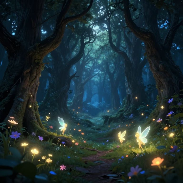 Feywild forest scene with sparkling streams, luminous flowers, and whimsical fairies dancing among towering silver-leafed trees, magical atmosphere, soft glowing light