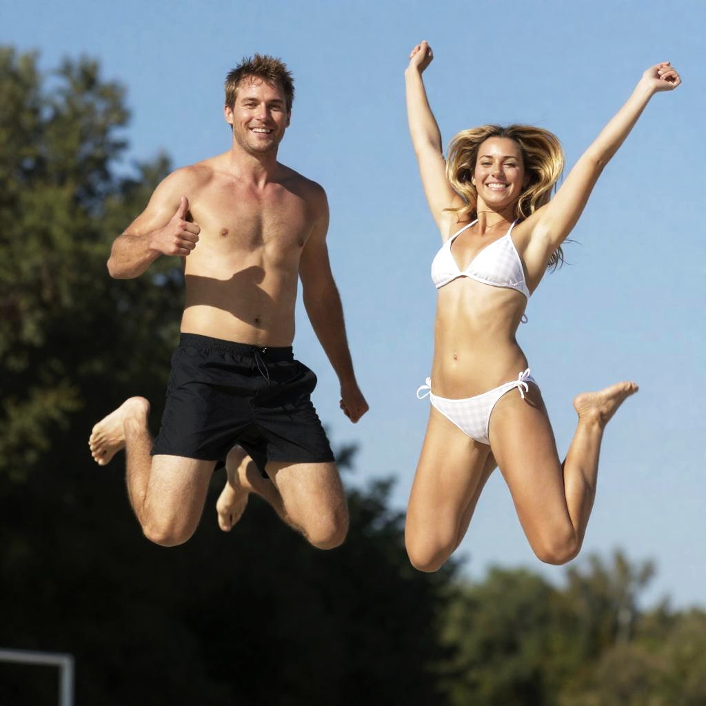 Photograph of a smiling blonde woman in a blue checkered bikini and a shirtless man in navy blue briefs holding hands, standing against a clear blue sky. Both lean slightly forward, facing each other. Woman on left, man on right.