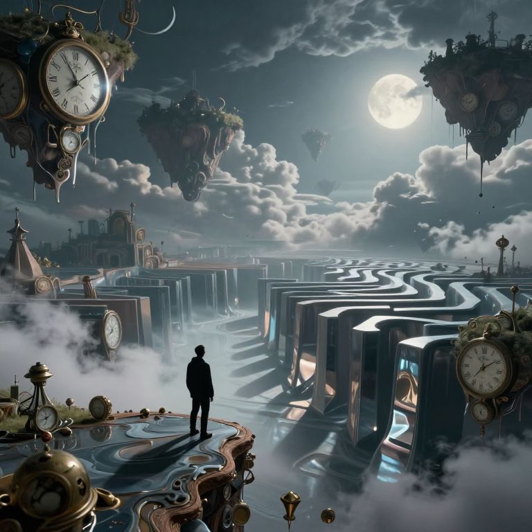 An enigmatic dreamscape emerges, reminiscent of surreal landscapes where impossible structures meld with floating islands. The viewer stands at the edge of an architectural wonder composed of melting timepieces and ethereal landforms, beckoning them into a labyrinthine network of hallways filled with distorted reflections on gleaming surfaces. Moonlit clouds cast shadows that dance across this fantastical realm, stirring feelings of intrigue, awe, and subtle unease as one delves deeper into the twisted world where reality blurs with imagination.