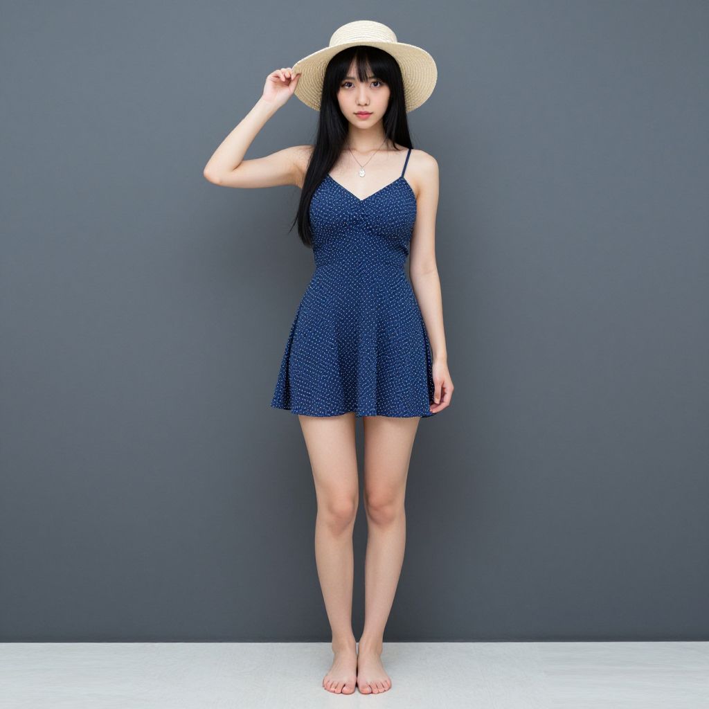 A digital rendering of an Asian woman standing against a solid gray background. She has long black hair, fair skin, and wears a white wide-brimmed hat. She is dressed in a navy blue, sleeveless, polka-dotted dress that flares out slightly above the knees. She is barefoot and stands with a relaxed posture, her right hand lightly touching the brim of her hat. Her expression is neutral, with slightly parted lips and subtle makeup. The lighting is even, highlighting the texture of her dress and the smoothness of her skin.