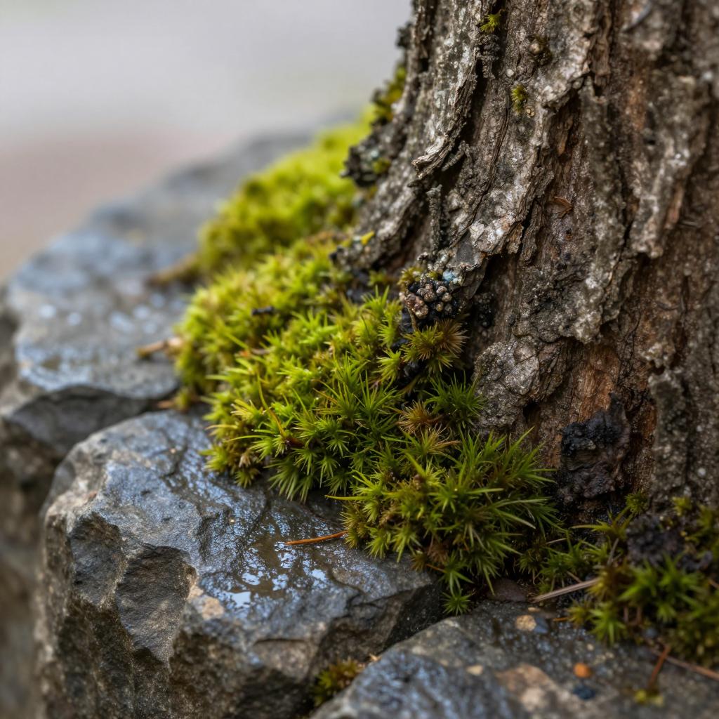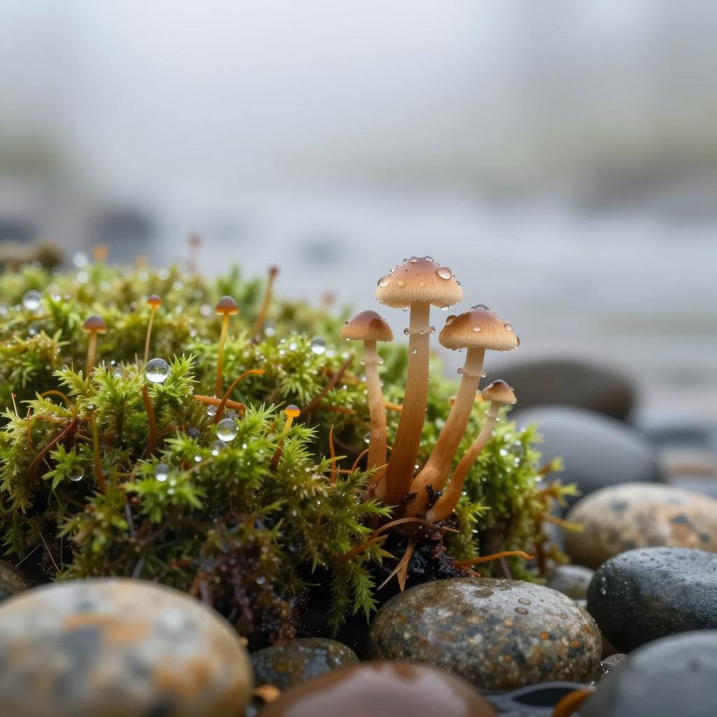Macro close-up of dew-covered green moss with tiny orange mushrooms on polished white quartz under early morning golden rays, 8K resolution, minimalistic, bright, authentic, healthy, vibrant, photorealistic.
