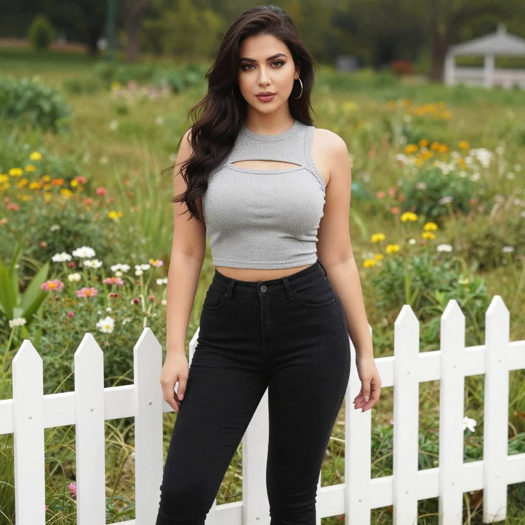 A curvy woman in contemporary streetwear, wearing a grey ribbed cut-out shoulder top and black high-waisted skinny jeans, stands in a floral meadow with a white picket fence, captured in a vibrant, modern visual style. Sexy. Pretty face and beutiful eyes
