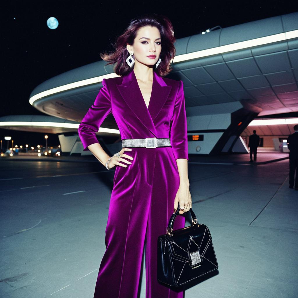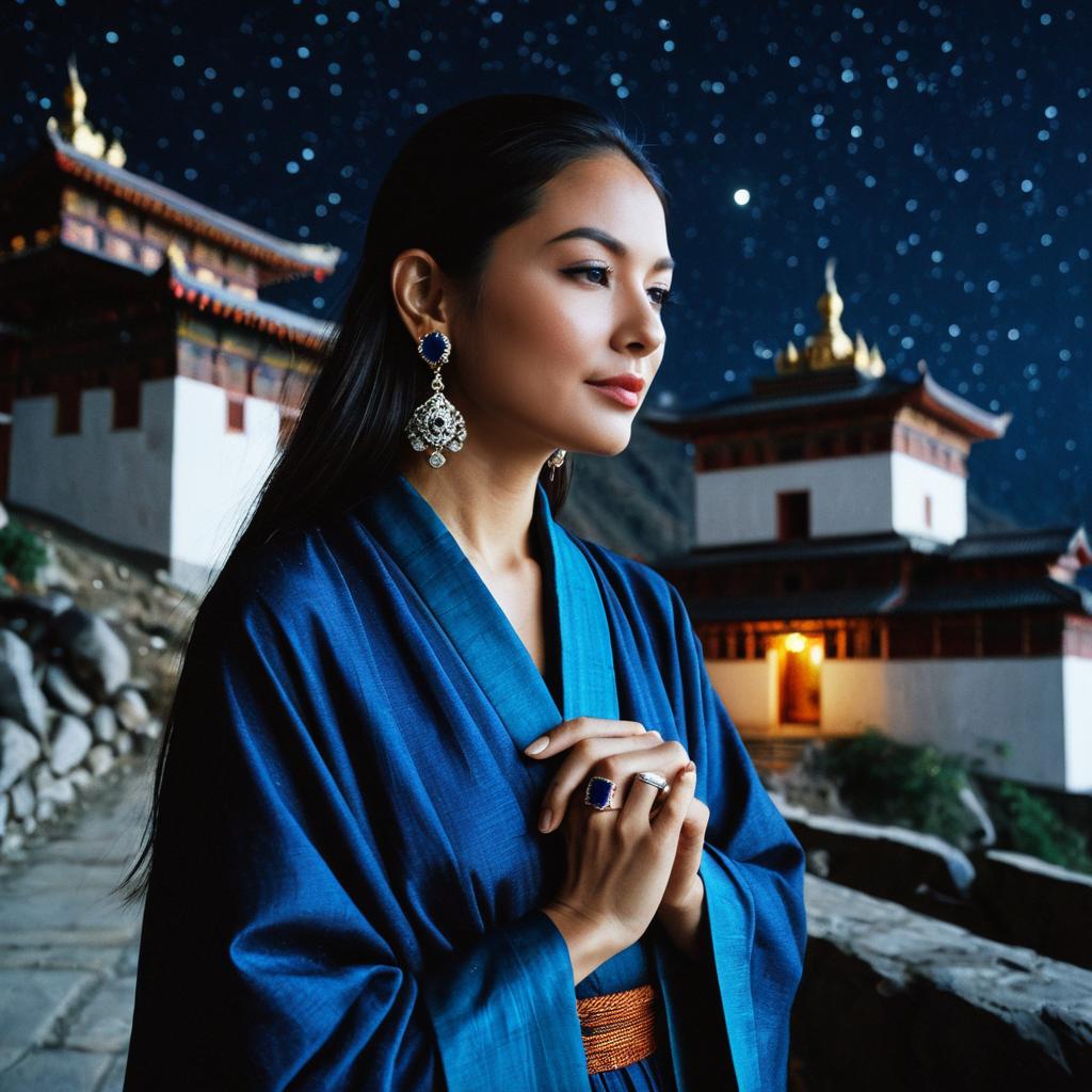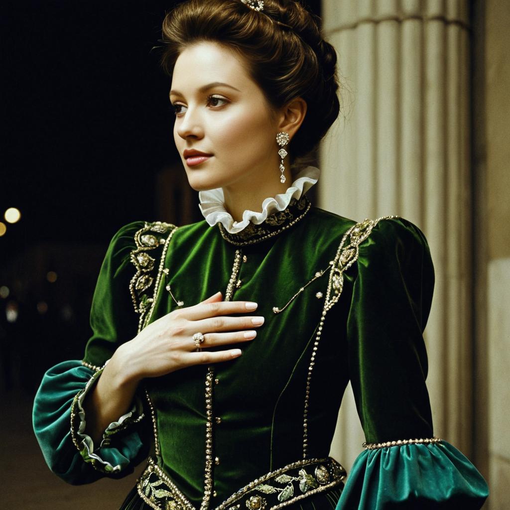 Ancient Celtic Glade. Night. A slim woman with striking vivid moss green that contrast with her fine face with clear lines and distinctive features. She wears a sparkling diamond ring and earrings with eye-catching gemstones. She wears a custom-tailored linen peper shirt with leather bodice made from the finest fabrics and carries a high-quality leather handbag in a simple design. Her hair has a natural shine and is so supple that it flows in the wind when she moves. It falls to the middle of her back and is often worn in a simple but elegant style that accentuates her distinctive features.