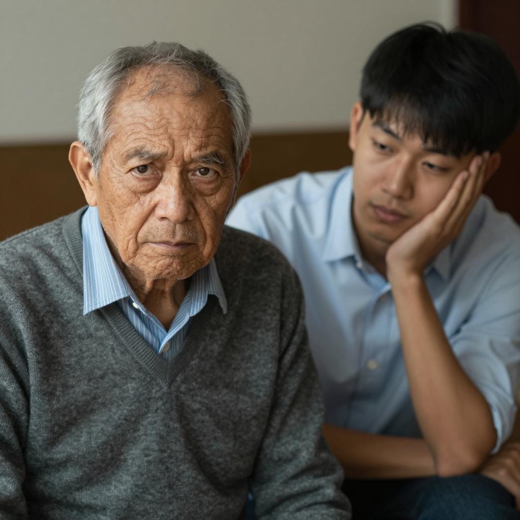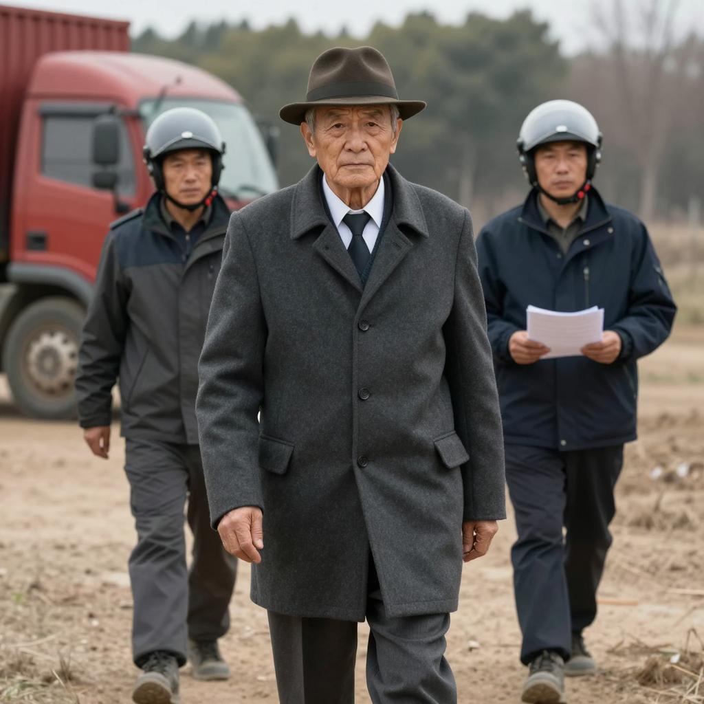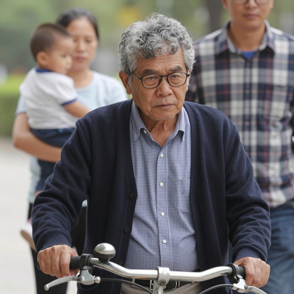 Photograph of five people riding bicycles on grassy terrain near a large bridge with water in the background. The elderly woman in the center wears a pink cardigan and gray skirt. Two young men in front wear light blue shirts and dark pants. A man in an orange shirt stands in the background. One young boy in a white shirt rides a black bicycle. Overcast sky, bridge in the distance.