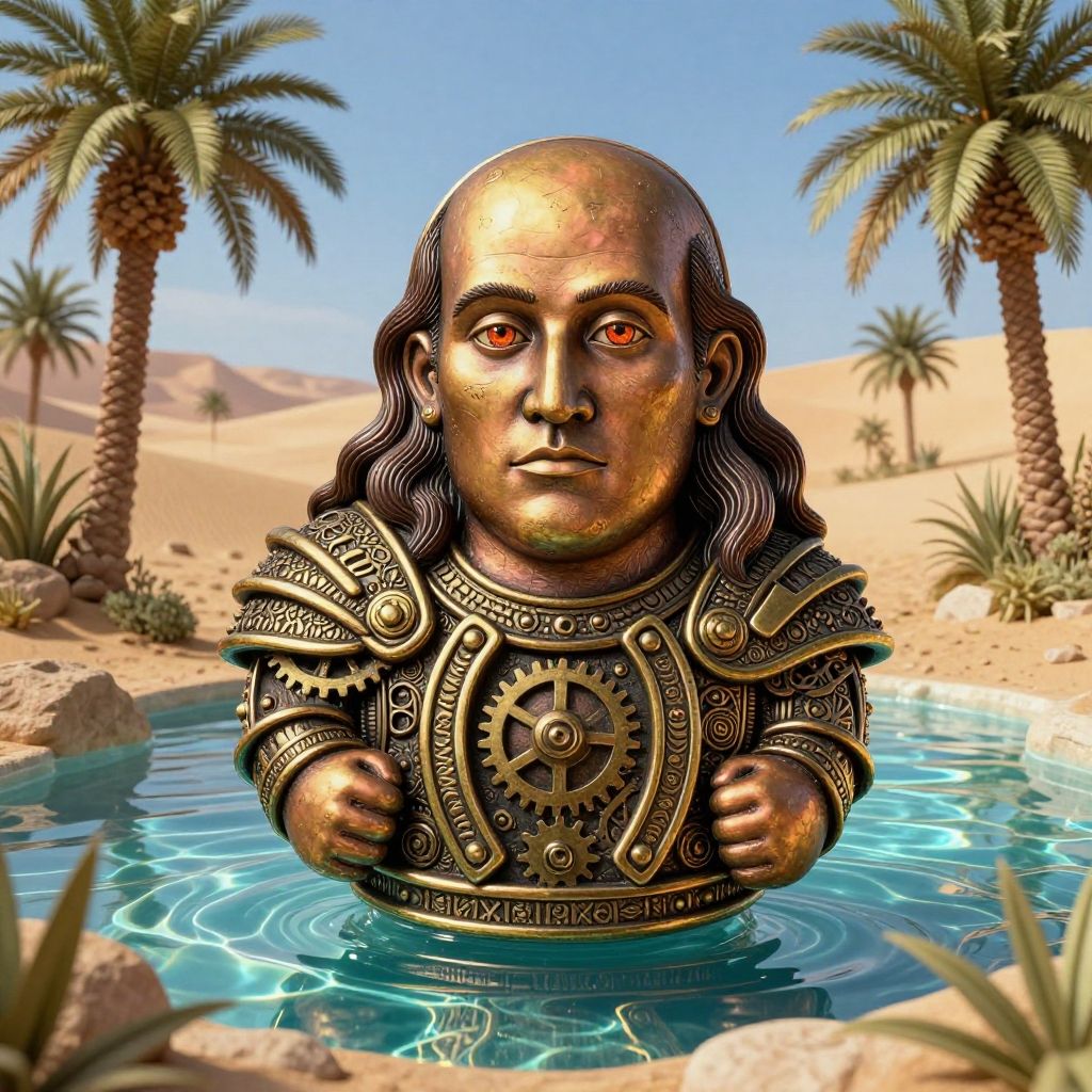 Line art trinket depicting a Warrior, King, Short, Chubby, Square Face, Olive Skin, Dark Brown Hair, coral Eyes, Short Nose, Thin Lips, Prominent Chin, Horseshoe, Bald, Side Part, A desert oasis, with shimmering pools of crystal-clear water and palm trees swaying in the breeze Willem van Haecht, natural, shimmering, vibrant, gothic, rpg, 1400ad, ultra detailed, detailed, immersive, reminiscent of high fantasy RPG games, HD, masterpiece, best quality, hyper detailed, super realistic, perfect face, perfect hands, award-winning, professional, breathtaking, linquiveradreary Oasisdazzling weathersteampunk style . antique, mechanical, brass and copper tones, gears, intricate