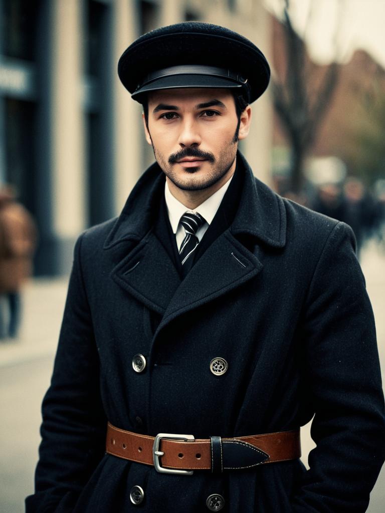 Person costume male fancy, male focus, belt, hat, 1boy, blurry background, blurry, realistic, solo focus, facial hair, looking at viewer, mustache, belt buckle, black coat, buckle, buttons, black headwear, brown belt, coat, long sleeves, short hair