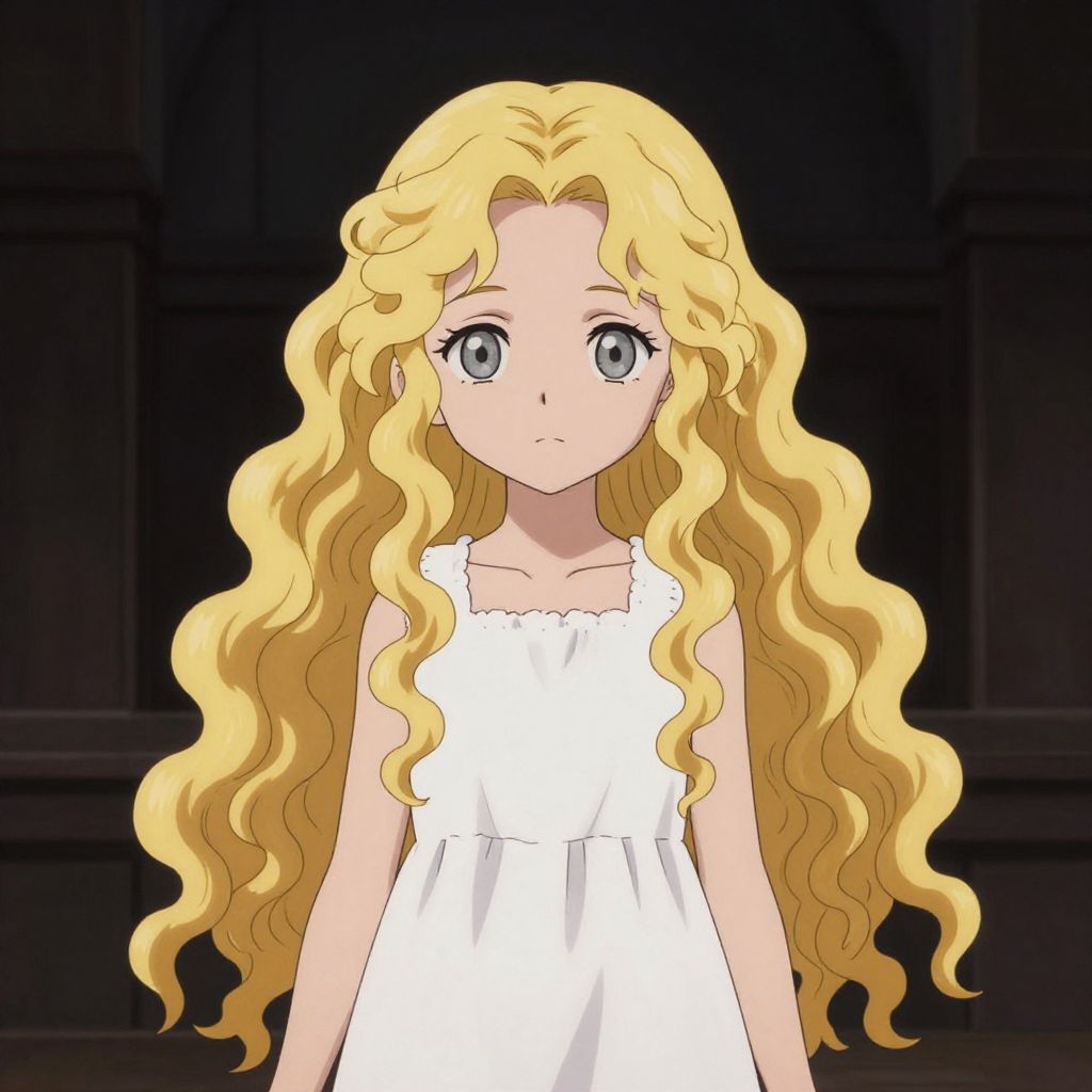 Digital anime-style illustration of a young girl with long, wavy blonde hair, wearing a white sleeveless dress, against a dark background. She has