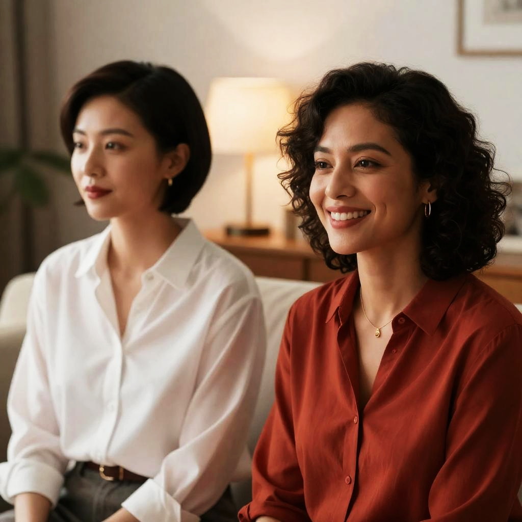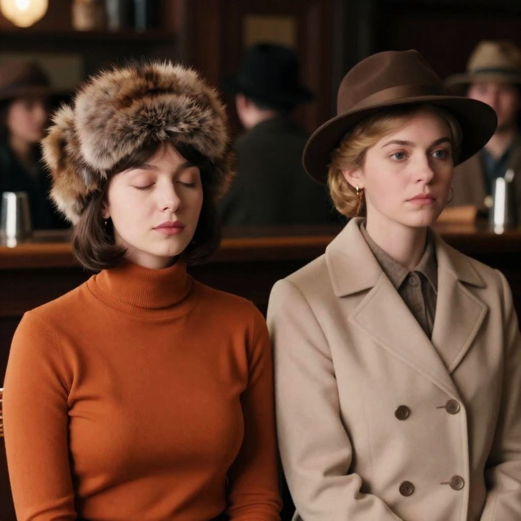 Two women standing in a retro office setting. The woman on the left has short blonde hair, wearing a yellow turtleneck sweater, dark pants, and a gold necklace, looking to her left. The woman on the right has dark hair covered with a light headscarf, dressed in a grey coat and white turtleneck, looking down. A man in a dark suit and glasses stands in the background. Office environment with vintage-style posters on the wall.