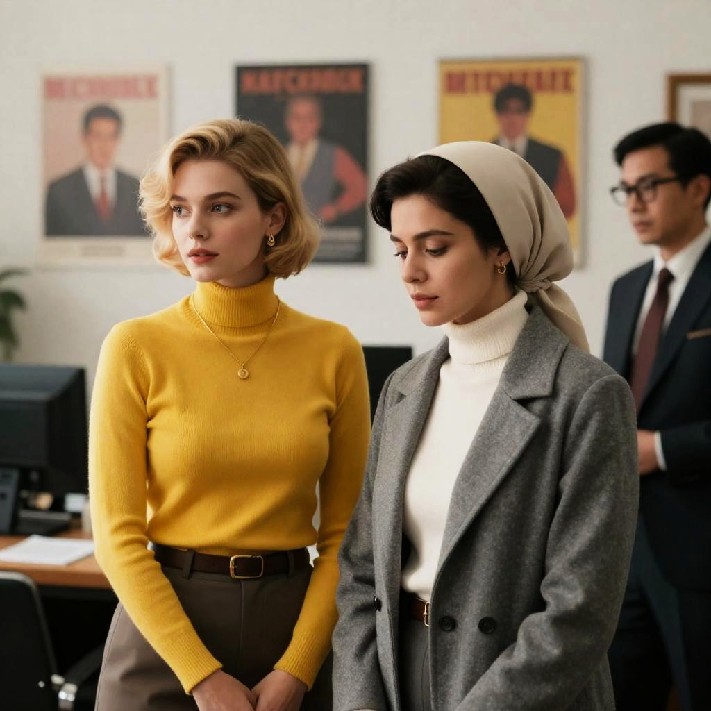 Two women in a retro office. Blonde woman with short hair in yellow turtleneck, gold necklace, looks left. Brunette woman with headscarf, grey coat, white turtleneck, looks down. Man in suit, glasses, right background. Posters on wall.