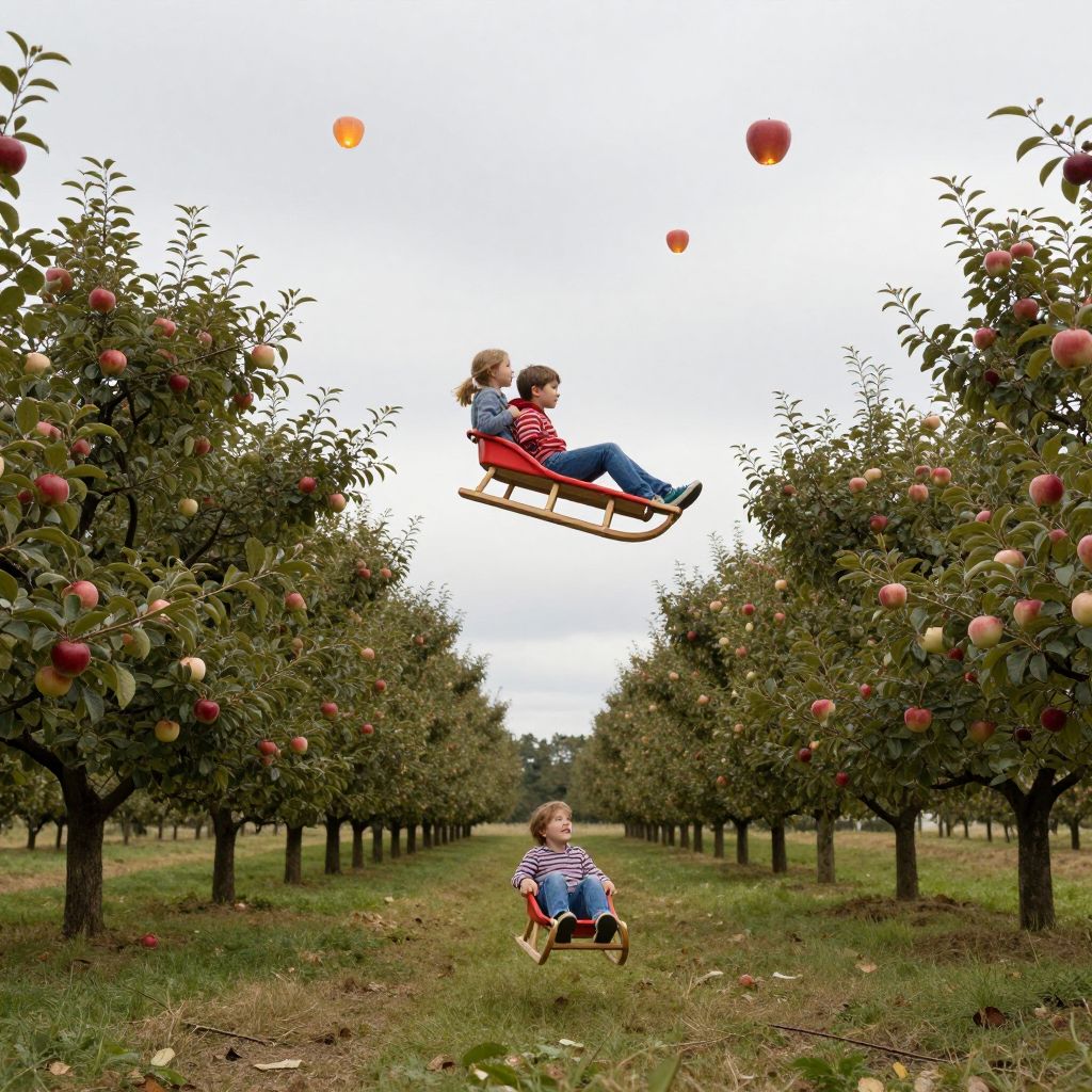 In a gravity-defying orchard where apples ascend like celestial lanterns, children soar on floating sleds, embodying the boundless freedom and wonder of childhood amidst a surreal, dreamlike landscape.