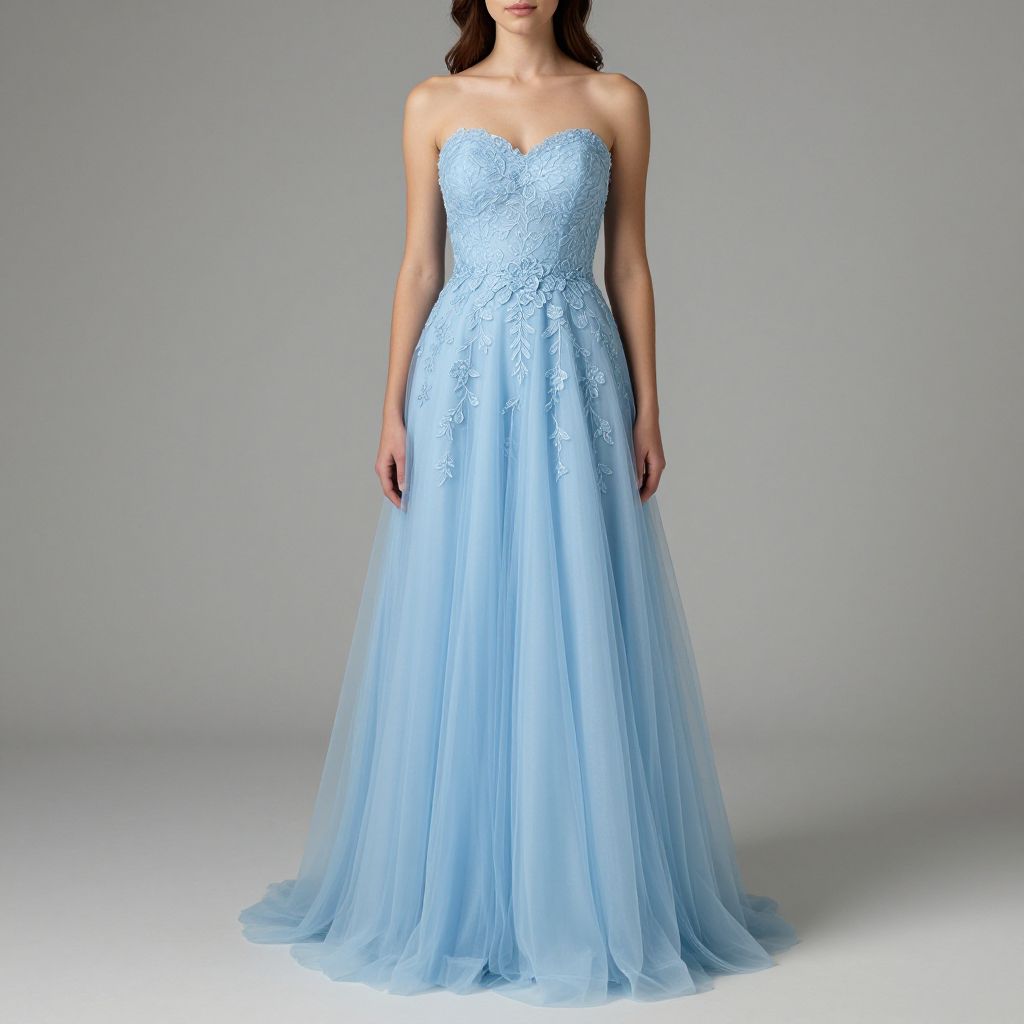 Elegant woman wearing a light blue sweetheart-necked tulle lace long prom dress with intricate floral appliqués cascading down the bodice and waistline, complemented by a flowing skirt that gracefully drapes to the floor against a neutral gray backdrop.