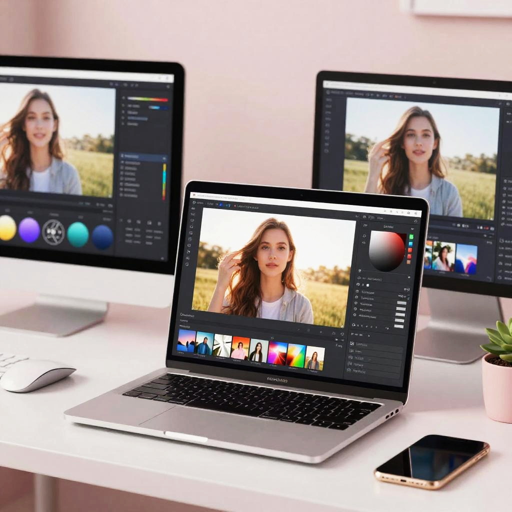 Creative workspace showing a free AI photo editor running on a laptop, multiple screens displaying advanced tools, AI-powered enhancements in real-time, soft ambient lighting, high-tech but accessible environment, clean and modern aesthetic with pastel tones.