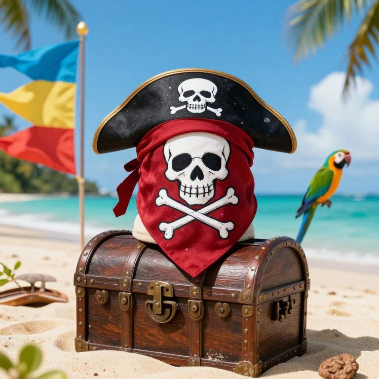 Female pirate bandana adorned with skull and crossbones, perched atop a treasure chest on a sandy beach, tropical island backdrop, fluttering flags, exotic parrots, vibrant colors, detailed textures, sunny atmosphere, adventure theme