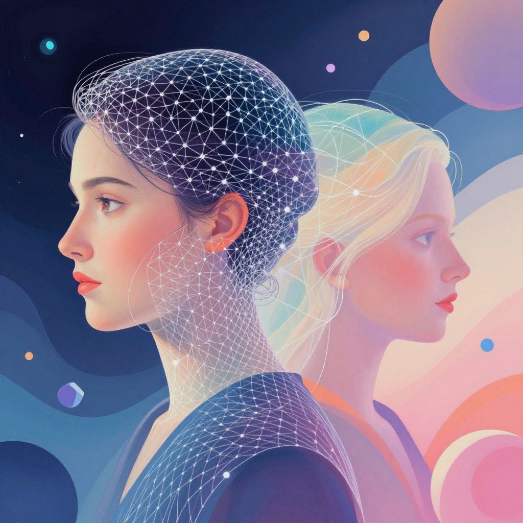 Digital artwork depicting two women in profile against a cosmic background. The woman on the left has fair skin, dark hair in a bun, and is highlighted with a glowing white wireframe mesh over her head, showing intricate geometric patterns. She wears a dark top. The woman on the right has blonde hair in a loose updo, fair skin, and wears a pink top. Both women have serene expressions, and the background features colorful, glowing orbs and abstract shapes in shades of blue, pink, and purple. The style is futuristic and ethereal.
