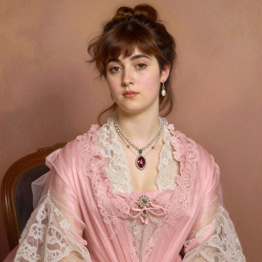 Photorealistic digital painting of a fair-skinned woman with dark brown hair, wearing a pink lace-trimmed dress and a pearl necklace with a