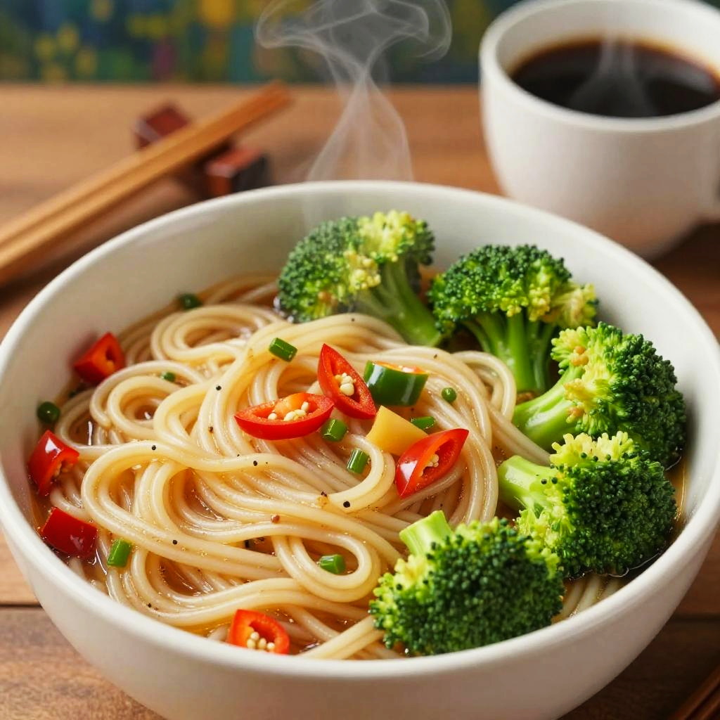 . Photorealistic close-up shot of a bowl of freshly cooked noodles with vibrant green broccoli and colorful peppers on a wooden table, chopsticks and a steamy cup of coffee in the background. Shot with a macro lens for exquisite detail and natural lighting, reminiscent of a food magazine cover. Claude Monet inspired art style with attention to texture and detail, trending on Instagram for its unforgettable composition and colors.