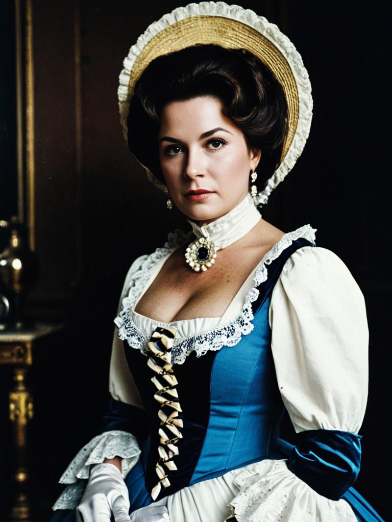 Woman in Miss Elizabeth Costume, cinematic realism, dramatic historical cosplay photo