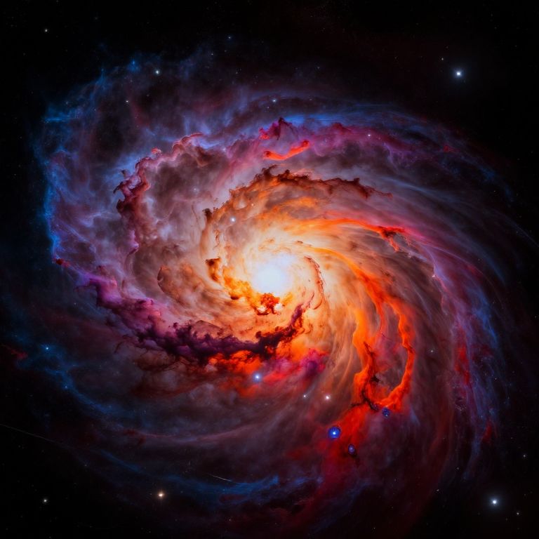 A vibrant, digital photograph of a swirling galaxy nebula. The center is a bright, white, luminous core surrounded by a spiral of fiery orange and red gas clouds. Dark, purple and blue clouds form an outer ring, creating a striking contrast. Stars are scattered across the dark, black background, adding depth to the cosmic scene. The swirling pattern and vivid colors evoke a sense of motion and energy in the vastness of space.