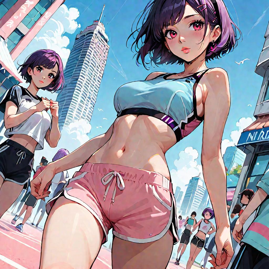 Score_9, score_8_up, score_7_up, source_anime, senakashiwazaki, shizuka mikazuki, short hair, purple hair, hair ornament, hairclip, pink eyes, swept bangs, navel, sports bra, sportswear, shorts, pink shorts, outdoors, cityscape, zombies, people, crowd, looking at viewer, cowboy shot, dutch angle, dynamic pose