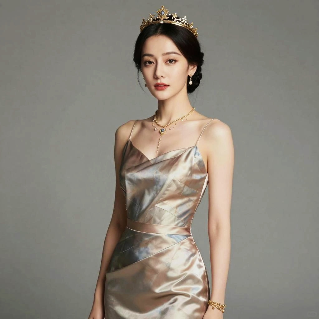 An elegant woman dressed in an artistic satin gown and adorned with a delicate golden tiara and jewelry, posing gracefully against a neutral backdrop. The refined style emphasizes a classic, regal look with a modern touch.