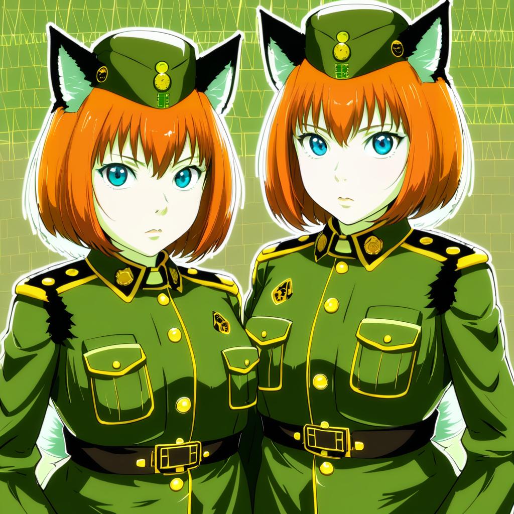 Digital anime style illustration of two wolf girls with orange bob haircuts, blue eyes, and wolf ears and tails. They are dressed in matching green military uniforms with golden buttons and insignia, standing side by side against a green grid background. The characters exhibit a strong, confident posture typical of military-themed anime.