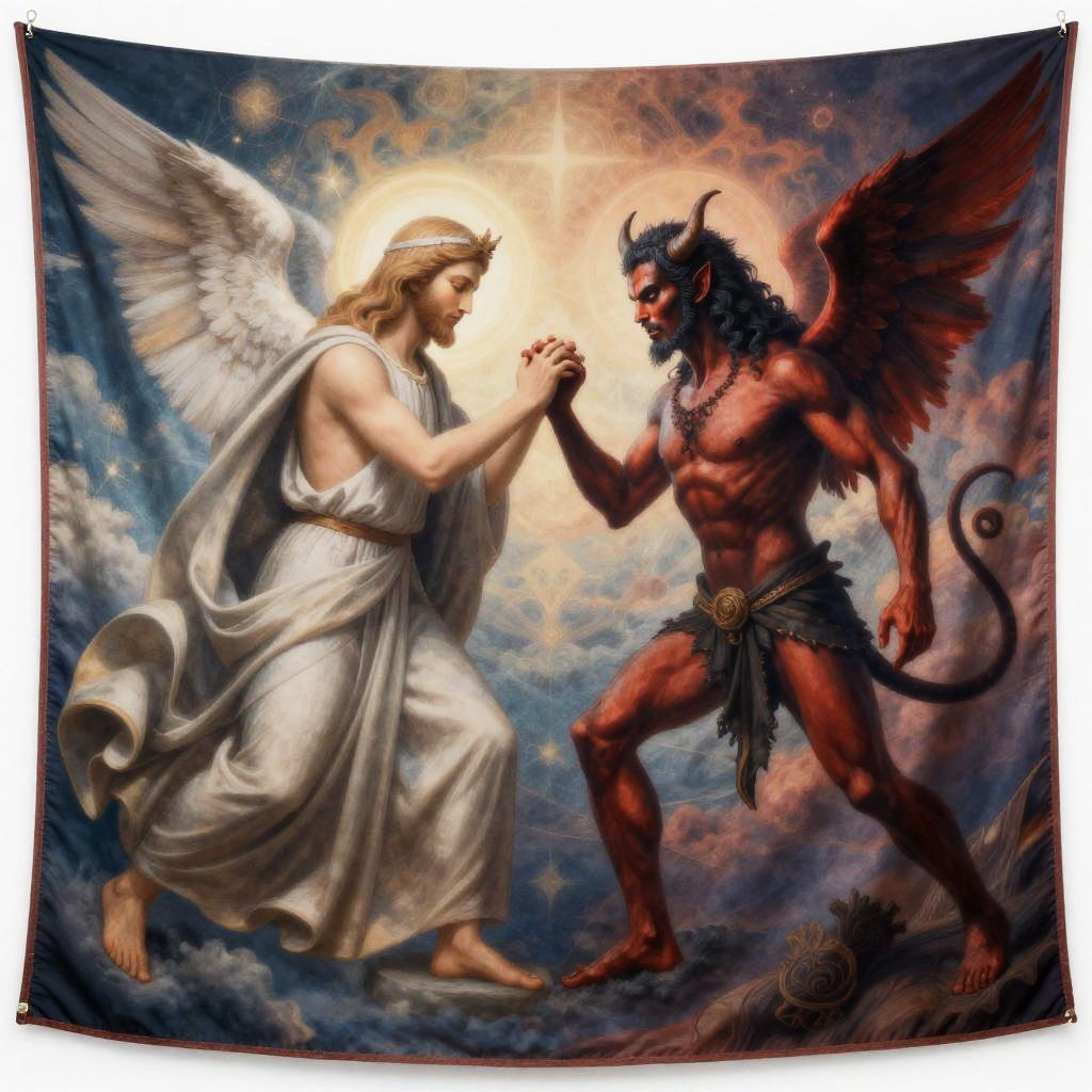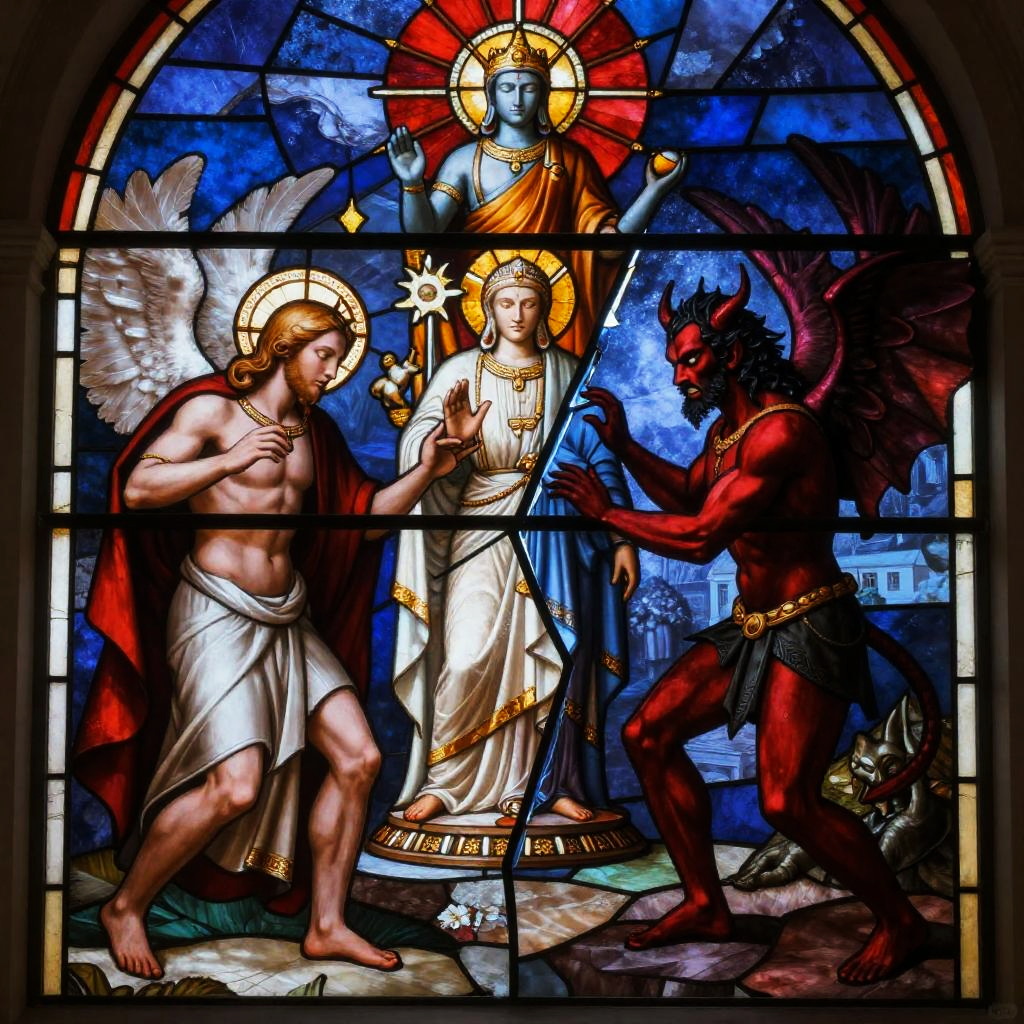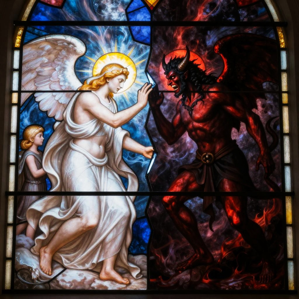 Foreground-Background Relationship God & the Devil colliding in a celestial rift from a stained glass window, christianity, buddhism, islam, creation and destruction, mercy and wrath, ethereal light vs consuming shadow, angels and demons, heaven and hell, demons and angels, light and dark,