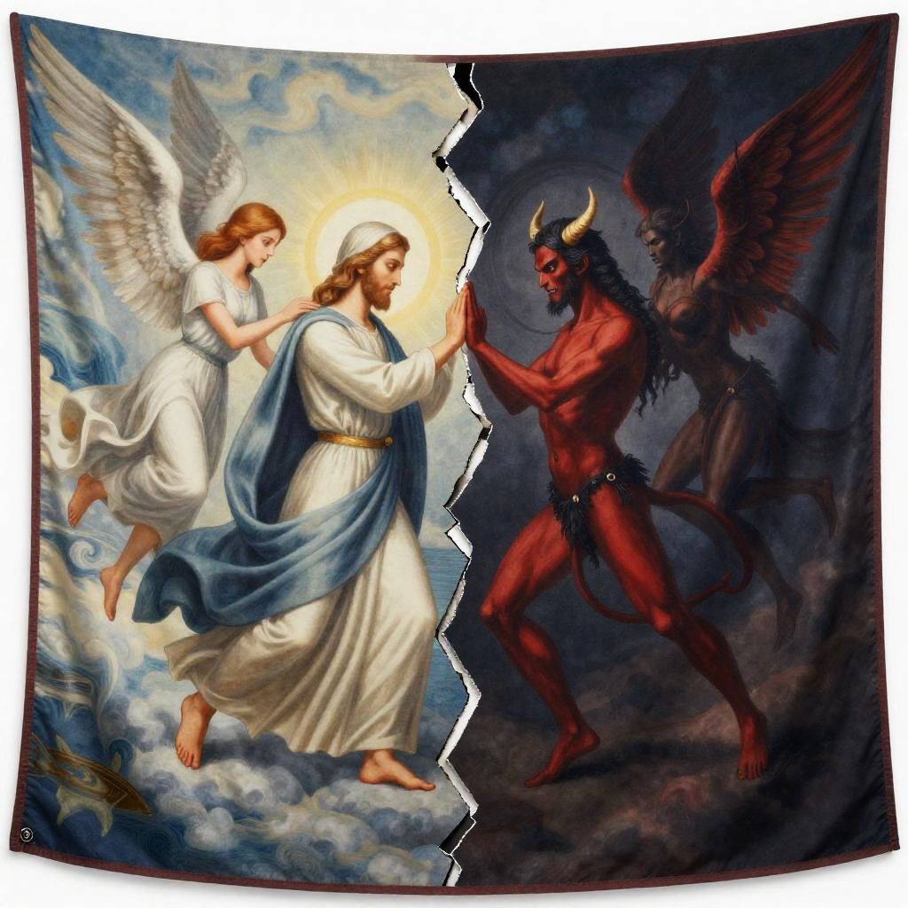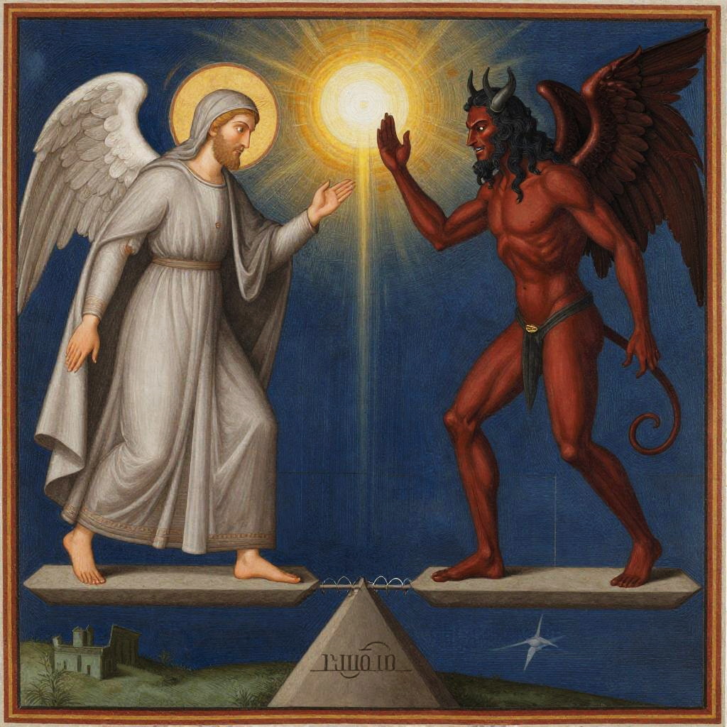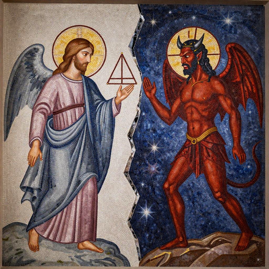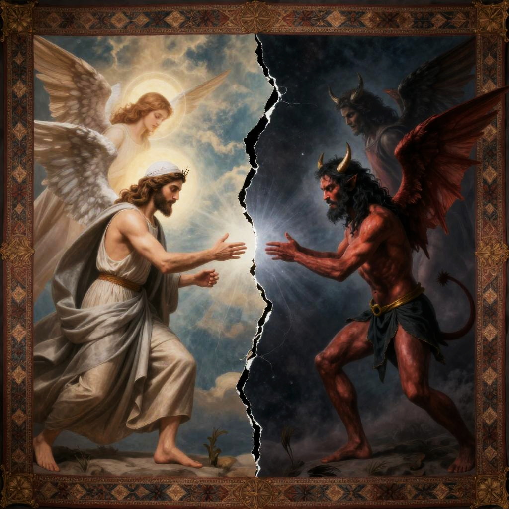 Foreground-Background Relationship God & the Devil colliding in a celestial rift from a stained glass window, christianity, buddhism, islam, creation and destruction, mercy and wrath, ethereal light vs consuming shadow, angels and demons, heaven and hell, demons and angels, light and dark,