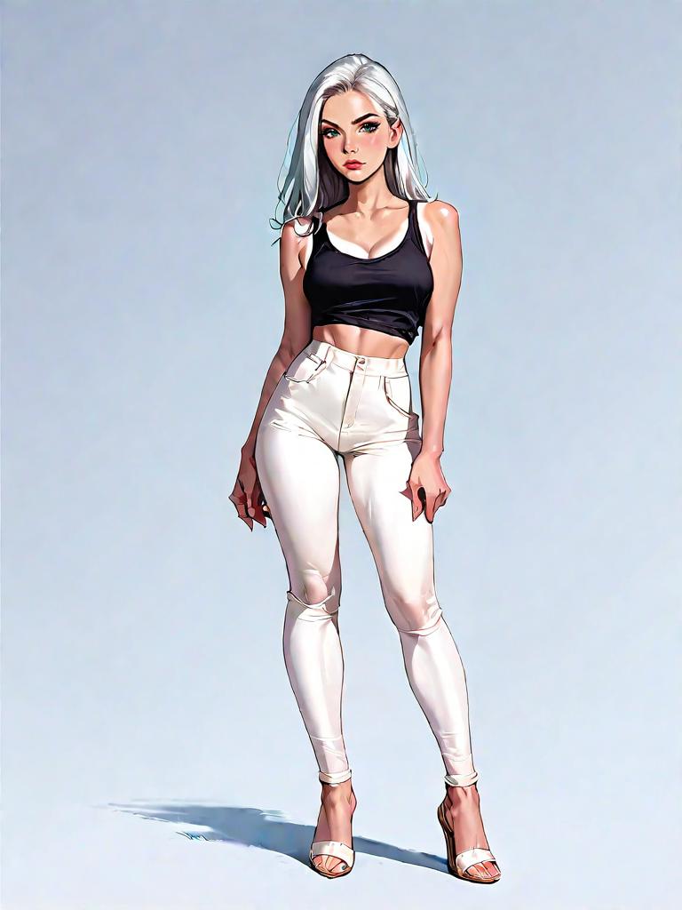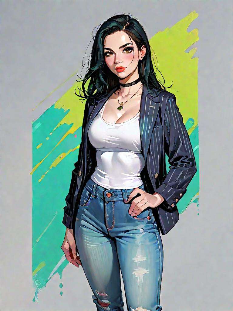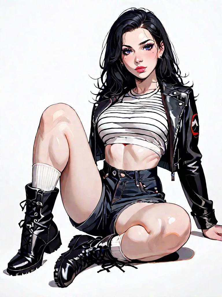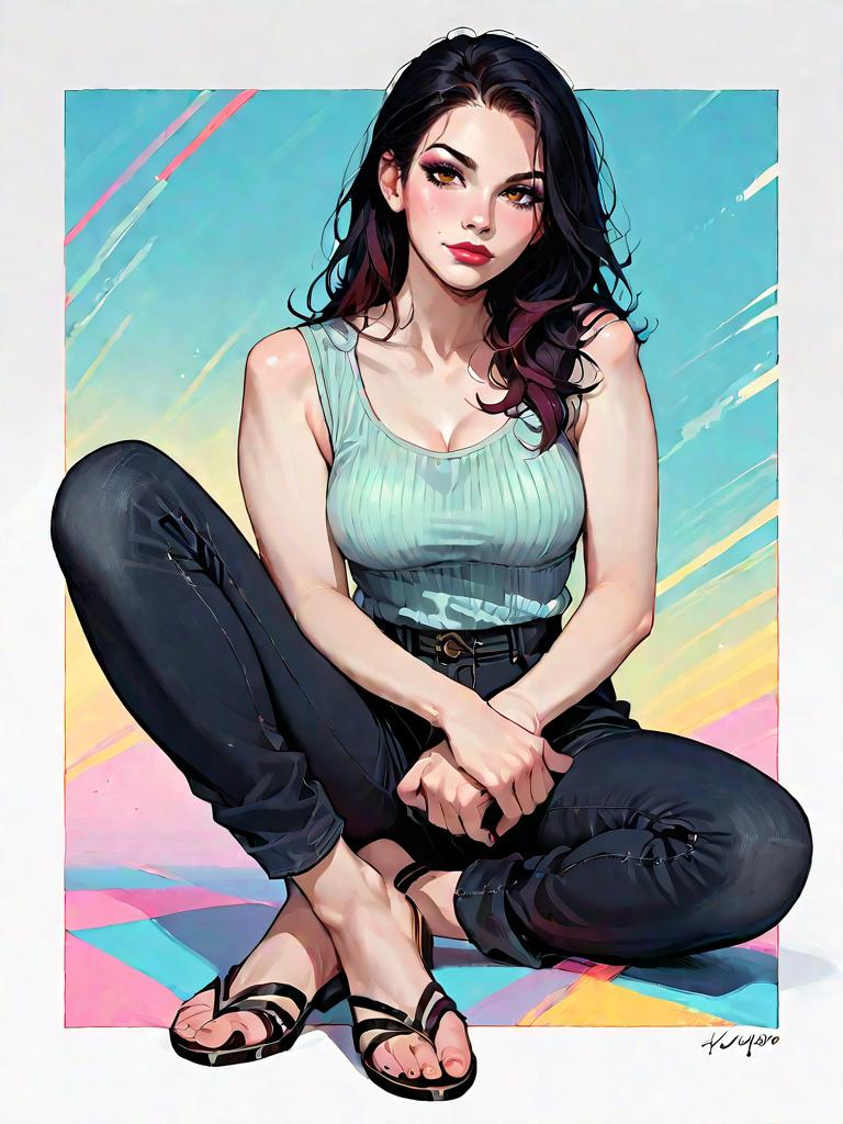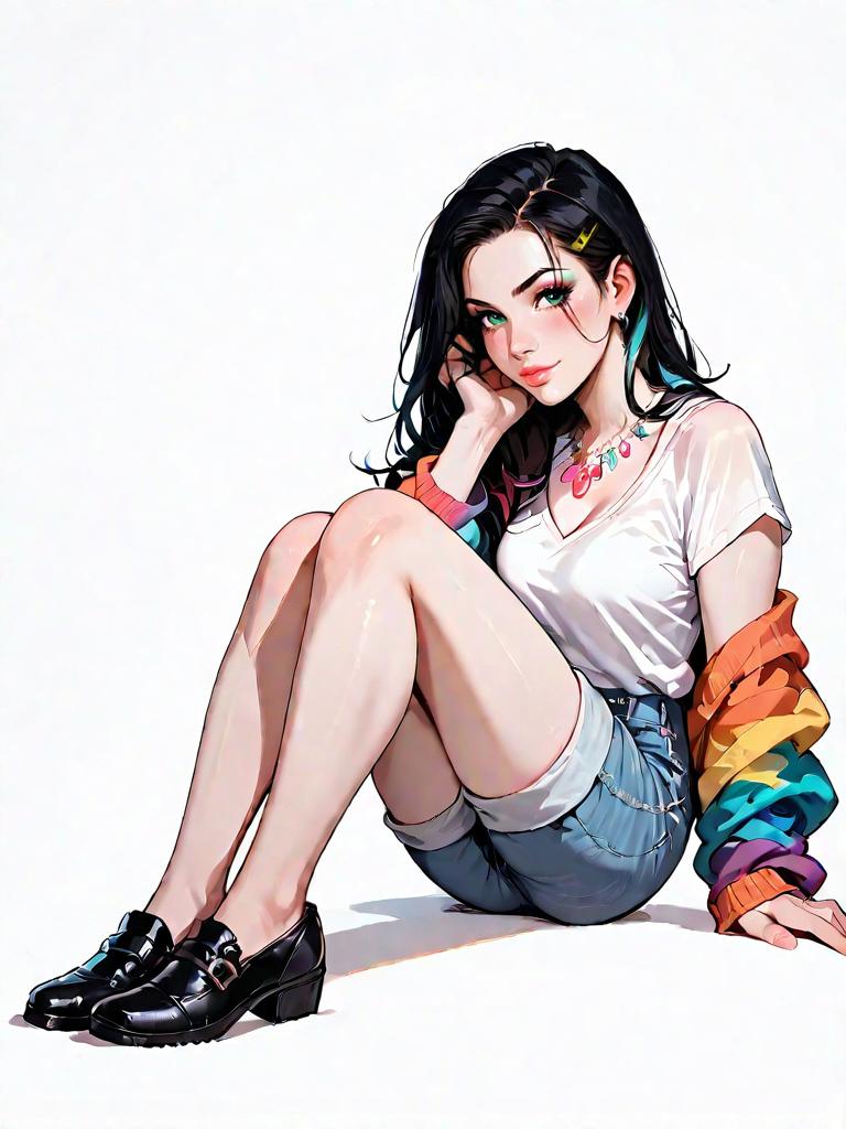 Illustration of a stylish woman with a realistic face sitting in a casual pose. She is wearing a white ribbed knit long-sleeve top and short mustard yellow shorts, paired with white and green low-top sneakers. The background is plain white, highlighting the woman’s fashion and posture.