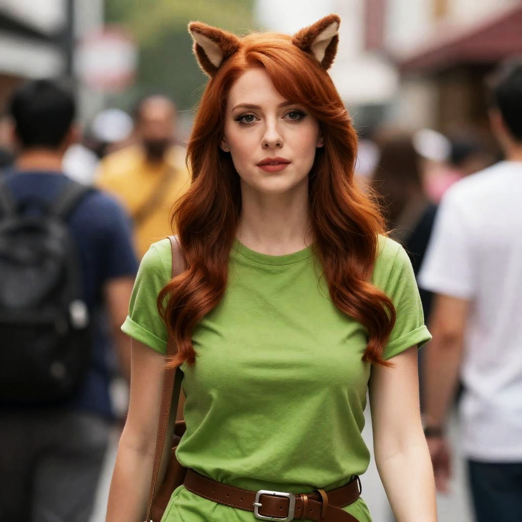 Foxy Lady, a woman with red hair and a cat ears is standing in front of a laptop
