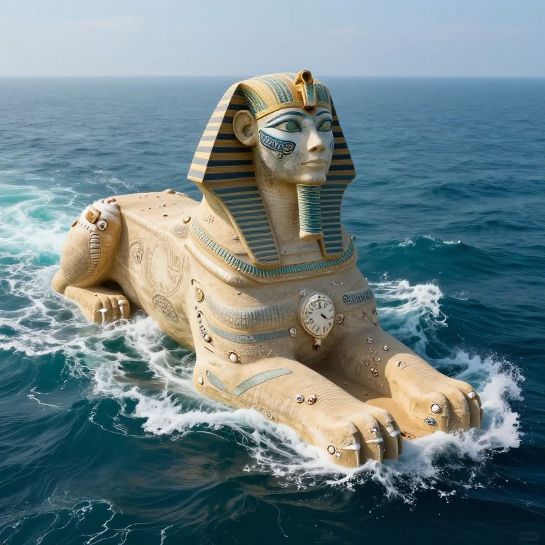 Craft an image embodying surrealism with an ancient Egyptian sphinx emerging from a tumultuous ocean wave, as if surfacing from the sea's depths. The sphinx appears to be sculpted entirely of sand and seashells, harmonizing seamlessly with its aquatic surroundings. Render this scene from an aerial viewpoint, capturing the awe-inspiring creature ascending towards the heavens, eliciting astonishment at the extraordinary amalgamation of elements. Employ intricate textures and elaborate patterns akin to melting clocks for added surrealism, creating a dynamic emotional spectrum that transitions from bewilderment to admiration in this high-resolution digital artwork.