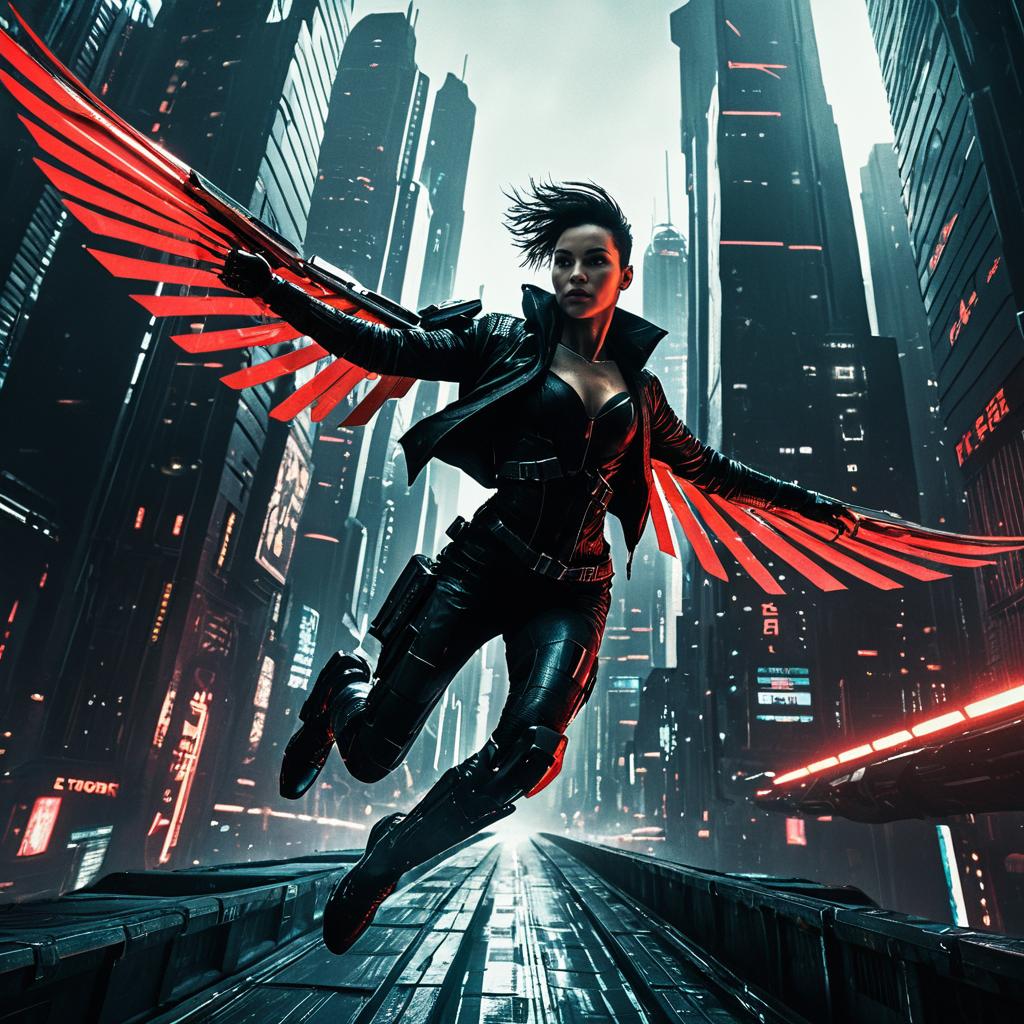 Portrait of futuristic samurai warrior soaring through cyberpunk city at dusk, rendered in digital watercolor painting with dramatic natural lighting, glistening skin and silver and red accents.