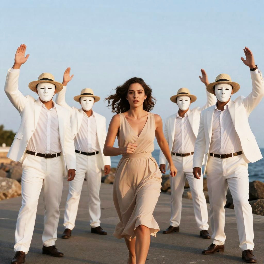 Photograph of a group of six people in an outdoor setting at sunset. Central woman with brown hair, wearing a beige, draped dress, runs forward with determined expression. Five men beside her wear white suits and straw hats, each with a white mask covering their faces, arms raised. Background includes a rocky shoreline and a clear sky. The group's dynamic poses and masks create a sense of urgency and mystery.