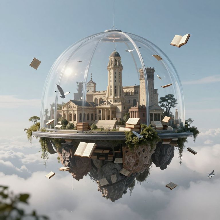 A skyless world hangs suspended in a glass dome, where floating islands anchor themselves to studies of ancient philosophy, and books flutter like birds.